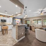 Discover this stunning 2-bedroom, den, 2-bathroom home. This immaculate property sits on a prime Sun City Tannery Cove view lot, SID paid. Located just steps from the pickleball courts and the upcoming Sun City Ballroom, this home places you at the heart of community recreation. The nearby Sun City Mesquite Pioneer Center offers additional amenities and social opportunities for residents. You will appreciate the proximity to Conestoga Golf Club.The home showcases professional desert landscaping and features a portable spa nestled within a screened patio. The yard is fully fenced. Inside, you’ll find custom touches throughout, including granite countertops with matching backsplash, white shaker cabinets, and crown molding details. The primary bedroom features a bay window, while the en suite bathroom boasts custom stone and tile flooring. Practical upgrades include remote window treatments, ceiling fans, reverse osmosis system, and water softener. The garage receives equal attention with recently installed mini-split heating and cooling, abundant cabinet storage, and epoxy flooring. Every detail has been carefully considered;n quick move-in ready Sun City home.
