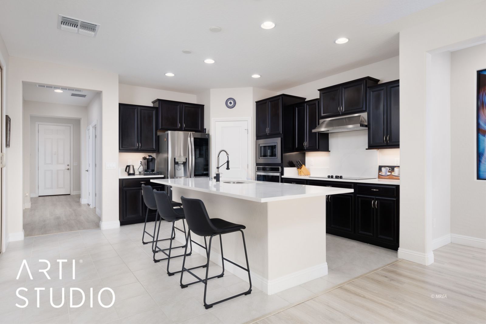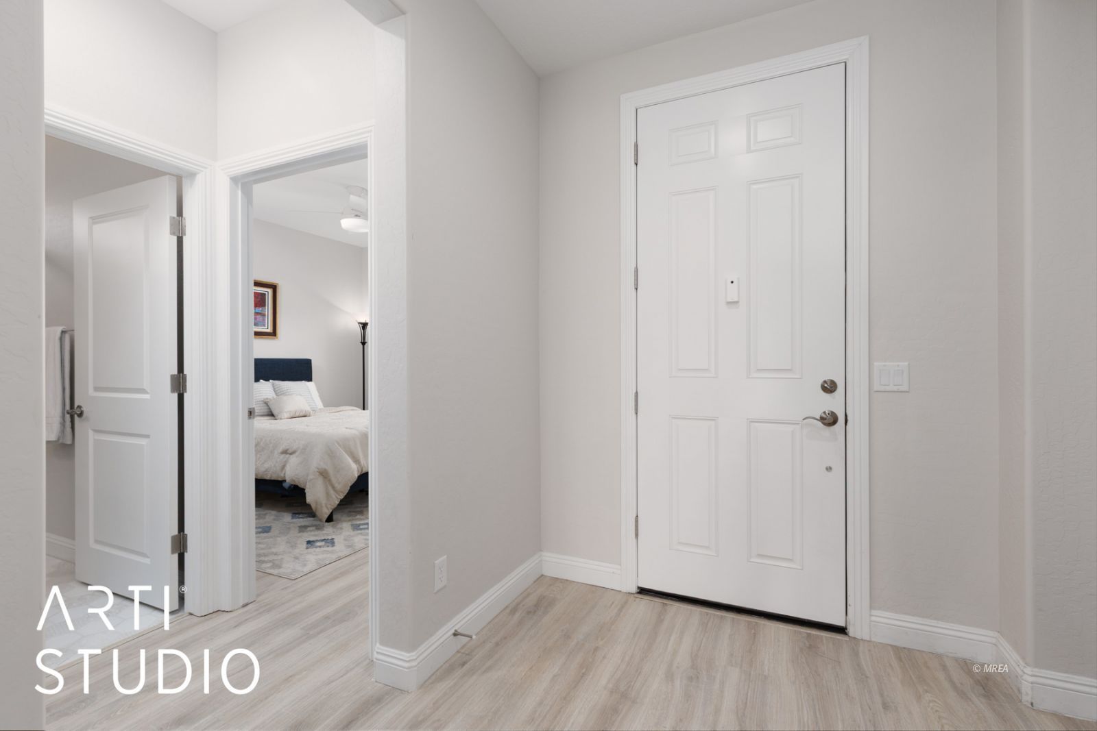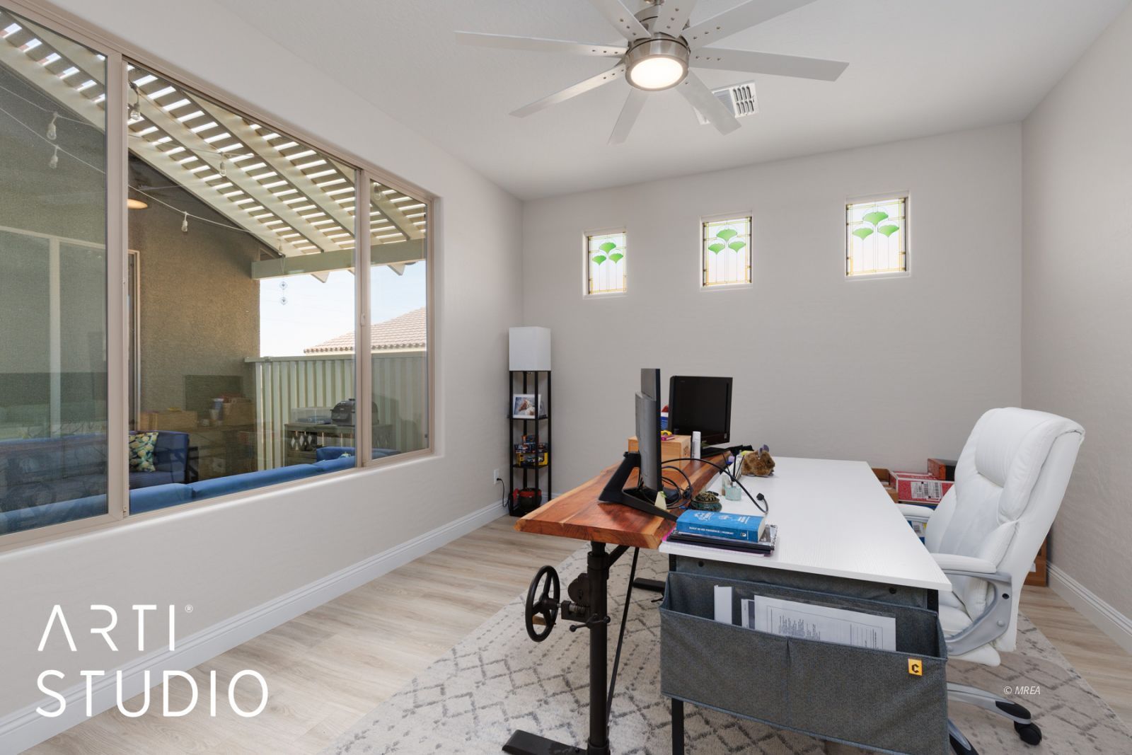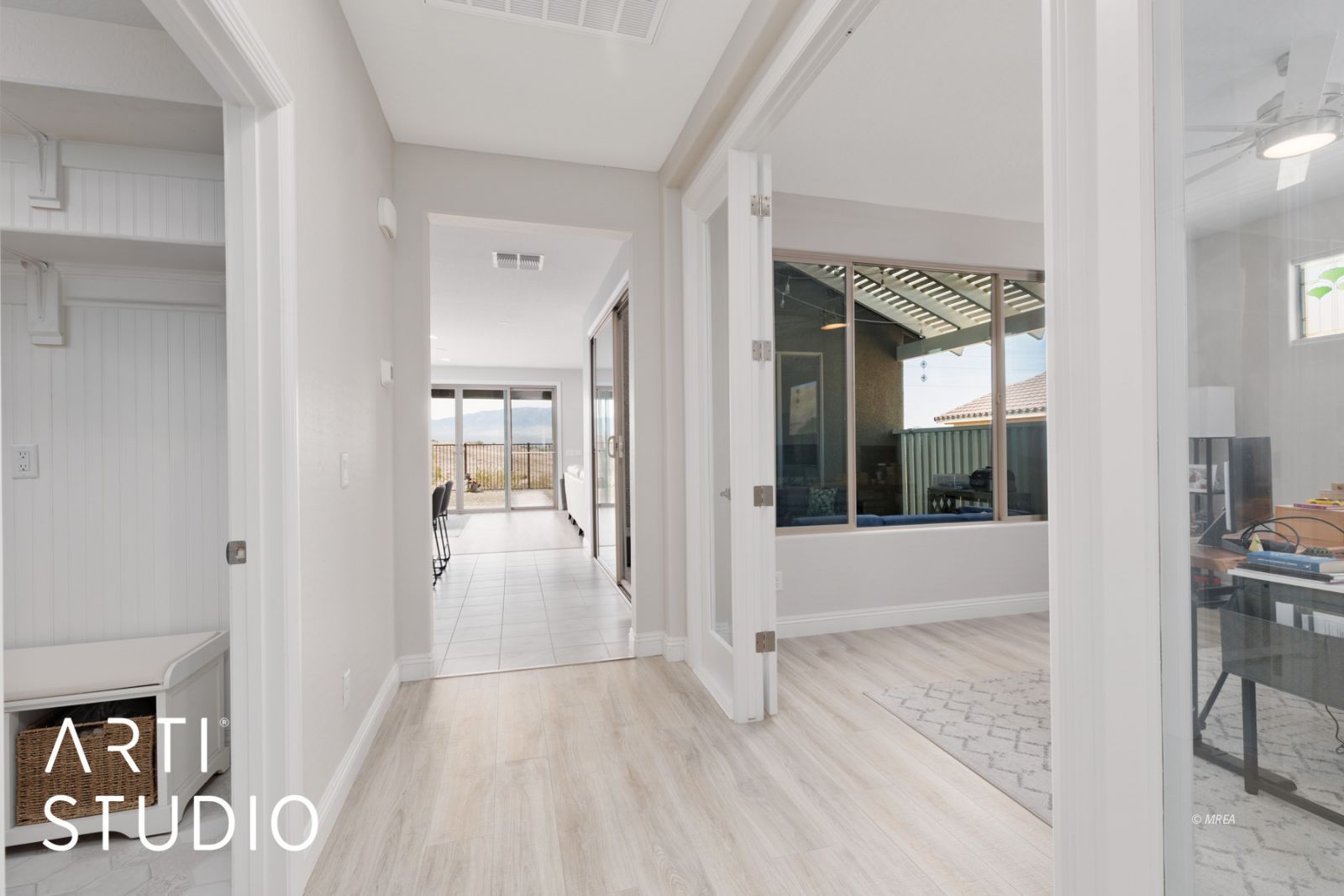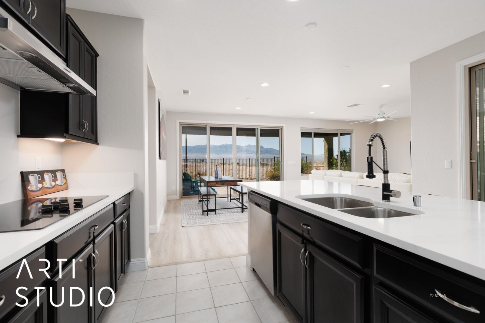 Beautiful like new home in Sun City Mesquite that brings you modern styling, full mountain views, and the perfect orientation to fill your home and patio with sunlight throughout the day. Located in a very quiet section of Sun City, this popular Haven model gives you a second covered patio that the owner has thoughtfully designed, utilizing a pergola with a privacy wall to give you that perfect place to open a book and relax outdoors. This home boasts a large den with double glass doors and is filled with natural sunlight. The light colors used throughout the home compliment the sunlight and create an inviting feeling throughout. Enjoy the open modern kitchen with a sizable island just feet away from the patio. LVP flooring and tile are the perfect combination in this home. Main bathroom has stunning walk-in shower and a roomy large walk-in main bedroom closet. 6′ extension on garage with custom flooring leaves plenty of room for your toys and vehicles. A must see home with unblocked mountain & valley views with no homes behind! Make this your winter retreat or your full time residence. Book your showing today