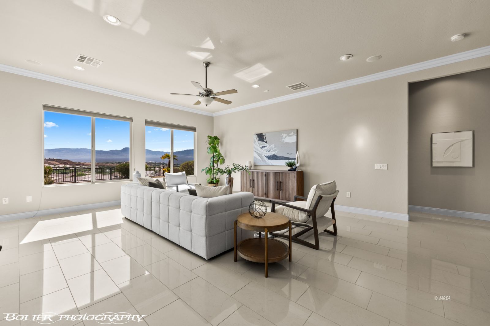 Welcome to 1348 Basin View, a remarkable residence located in the highly sought-after Prominence subdivision of Sun City Mesquite. Offering over 2,400 square feet of luxurious living space, this home is designed for those who appreciate elegance and modern comfort. The expansive open floor plan, which includes 3 bedrooms and 2.5 baths is adorned with exquisite porcelain tile that flows seamlessly throughout the home. The glamorous finishing touches include custom lighting, beautiful crown moldings and neutral paint tones, creating a cultured yet inviting atmosphere. Situated on a .25 acre elevated lot, this property boasts breathtaking tri-state views of the majestic mountaintops. The stunning vistas serve as a perfect backdrop for any occasion. The spacious layout of this home allows for versatile living, making it ideal for both relaxation and entertaining. The carefully thought-out design ensures that every corner of this residence contributes to a heightened sense of luxury. Don’t miss your chance to experience glamorous living in this exquisite home in Prominence. Schedule your personal tour today and discover the perfect blend of modern elegance and panoramic views!