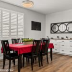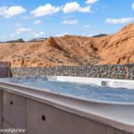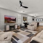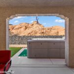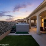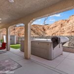 Designed for families or retirees, this stunning home blends style, comfort, and rare privacy. The backyard is fully fenced & backs to scenic natural bluffs, offering a stunning backdrop, featuring a luxurious Jacuzzi Swim Spa, expansive patio perfect for gatherings, dining al fresco, or quiet sunsets, and a custom Cornhole court for fun. Natural-colored vinyl plank flooring flows throughout, paired with high-end plantation shutters and custom ceiling fans. A large quartz island anchors the kitchen, featuring a modern stainless backsplash, crushed granite single-basin sink, all appliances included, and natural gas cooking. A custom-built buffet and bar with beverage fridge makes entertaining effortless. A flexible den/office suits work or hobbies, while the split-bedroom layout places the guest room opposite the private primary suite. Accessed through a custom barn door, the primary suite’s spa-inspired bath boasts under-mount square sinks, designer mirrors, and a subway-tiled shower. Laundry includes ample storage with washer and dryer, & the home features a Rheem water softener. Impeccably maintained, this home combines refined design, outdoor enjoyment, and everyday comfort.
