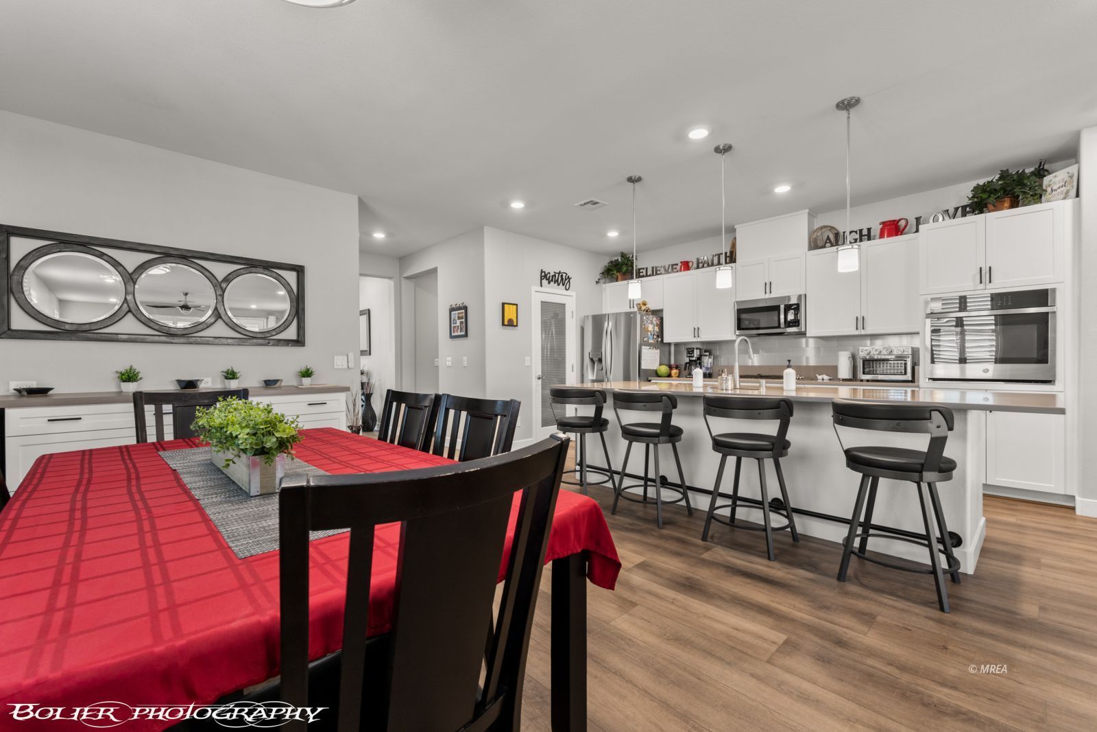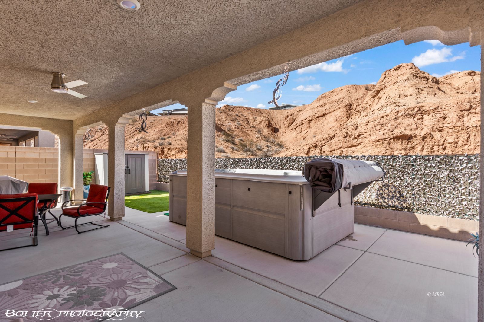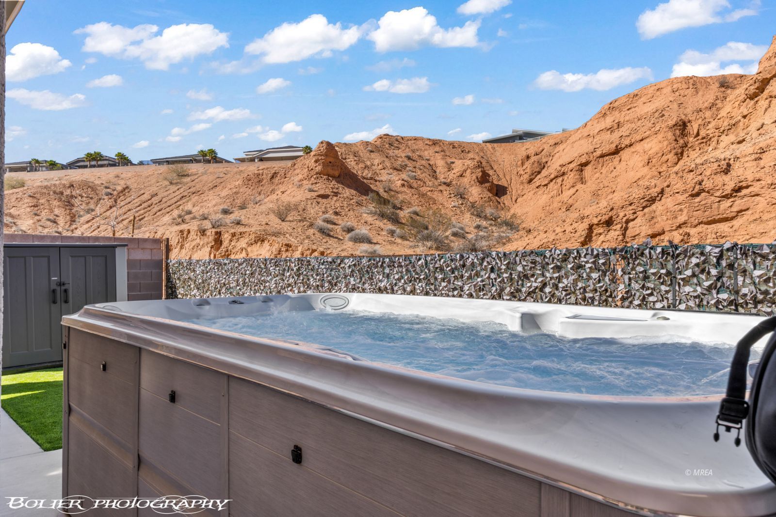 Designed for families or retirees, this stunning home blends style, comfort, and rare privacy. The backyard is fully fenced & backs to scenic natural bluffs, offering a stunning backdrop, featuring a luxurious Jacuzzi Swim Spa, expansive patio perfect for gatherings, dining al fresco, or quiet sunsets, and a custom Cornhole court for fun. Natural-colored vinyl plank flooring flows throughout, paired with high-end plantation shutters and custom ceiling fans. A large quartz island anchors the kitchen, featuring a modern stainless backsplash, crushed granite single-basin sink, all appliances included, and natural gas cooking. A custom-built buffet and bar with beverage fridge makes entertaining effortless. A flexible den/office suits work or hobbies, while the split-bedroom layout places the guest room opposite the private primary suite. Accessed through a custom barn door, the primary suite’s spa-inspired bath boasts under-mount square sinks, designer mirrors, and a subway-tiled shower. Laundry includes ample storage with washer and dryer, & the home features a Rheem water softener. Impeccably maintained, this home combines refined design, outdoor enjoyment, and everyday comfort.