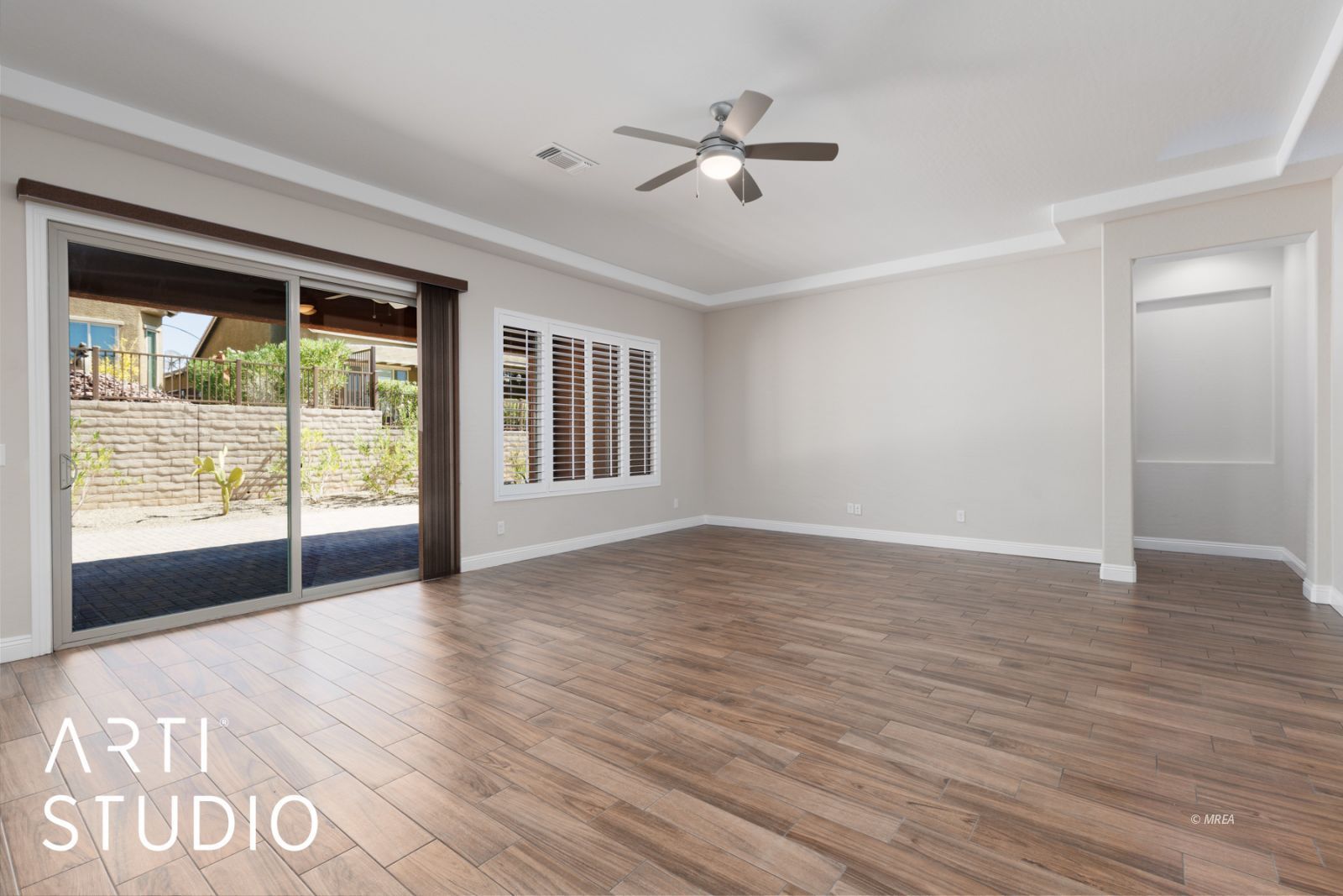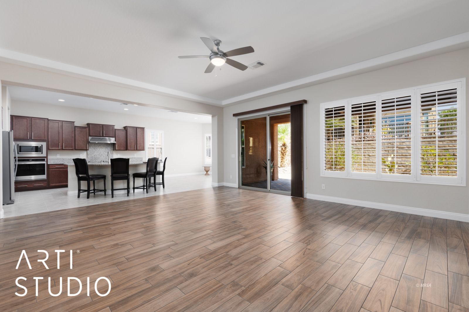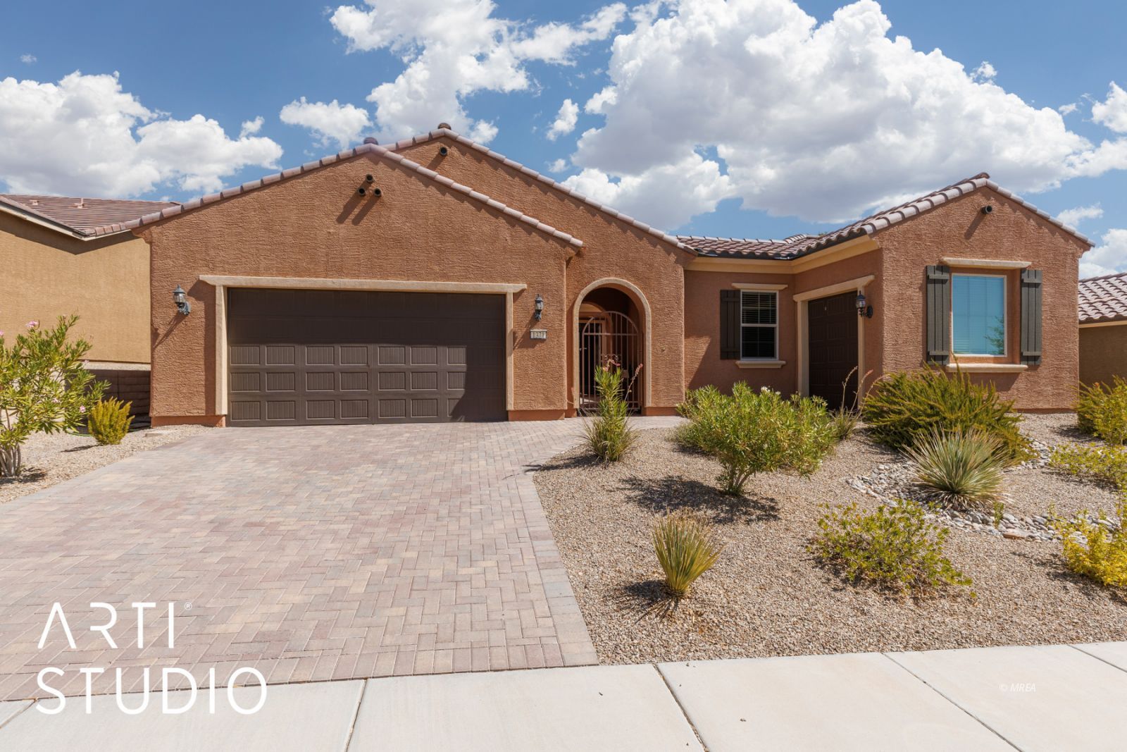 SIDS Paid & Priced to Sell! This Journey model at a generous 2537 sq/ft with a golf cart garage and fully a pavered courtyard is one of the best priced homes in Sun City Mesquite. This open and roomy floor plan boasts an open concept with the kitchen, dining room, and living room blending seamlessly together for the ultimate living experience with more than enough room to entertain your guests. A second bedroom functions as an ensuite with a full bathroom, walk-in closet and an window looking out into the courtyard. Enjoy the roomy main bedroom suite with tiled shower and walk-in closet. The rear covered patio has been extended giving it nearly double the space for entertaining or relaxing. Other upgrades included plantation shutters, upgraded tall baseboards and recently installed beautiful plank tile flooring throughout the home. Other notables are, a large pantry, utility area with a upgraded cabinets, and a good sized laundry room tucked away from the living area. This home is in move in ready condition with neutral colors thought, making for an easy move in. Book your showing today.