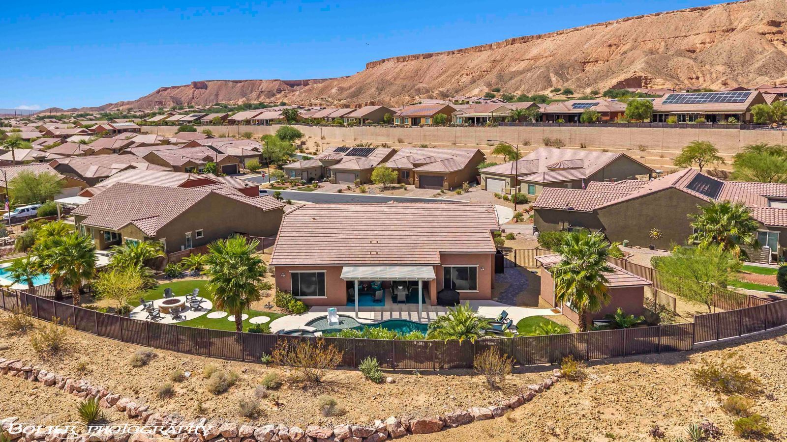 Discover your dream home on an amazing panoramic view elevated .29 ac lot nestled on a quiet cul-de-sac in Mesquite’s desirable Sun City community. This beautiful Pursuit model & custom casita offer 2,258 square feet of living space which includes 3 BR, 3BA, plus den. You will enjoy the easy to care for tile found throughout the home. The custom espresso cabinets are exquisite and complement the granite counters. The bathroom has a spa like feel with the jetted tub and rain head shower. The garage is extended to accommodate your vehicles. The backyard is where the magic happens. It’s like having your own private getaway with a gorgeous custom pool with waterfalls and spa. Enjoy the amazing views from the extra large sitting area complete with propane connected fire pit. This home is close to all amenities. Visit the Conestoga Golf Club for a round or grab dinner at the 1880 Grille. The Sun City Rec Center & pickleball, the courts are nearby. This is the one! Video https://youtu.be/yfjDMY4nDeo