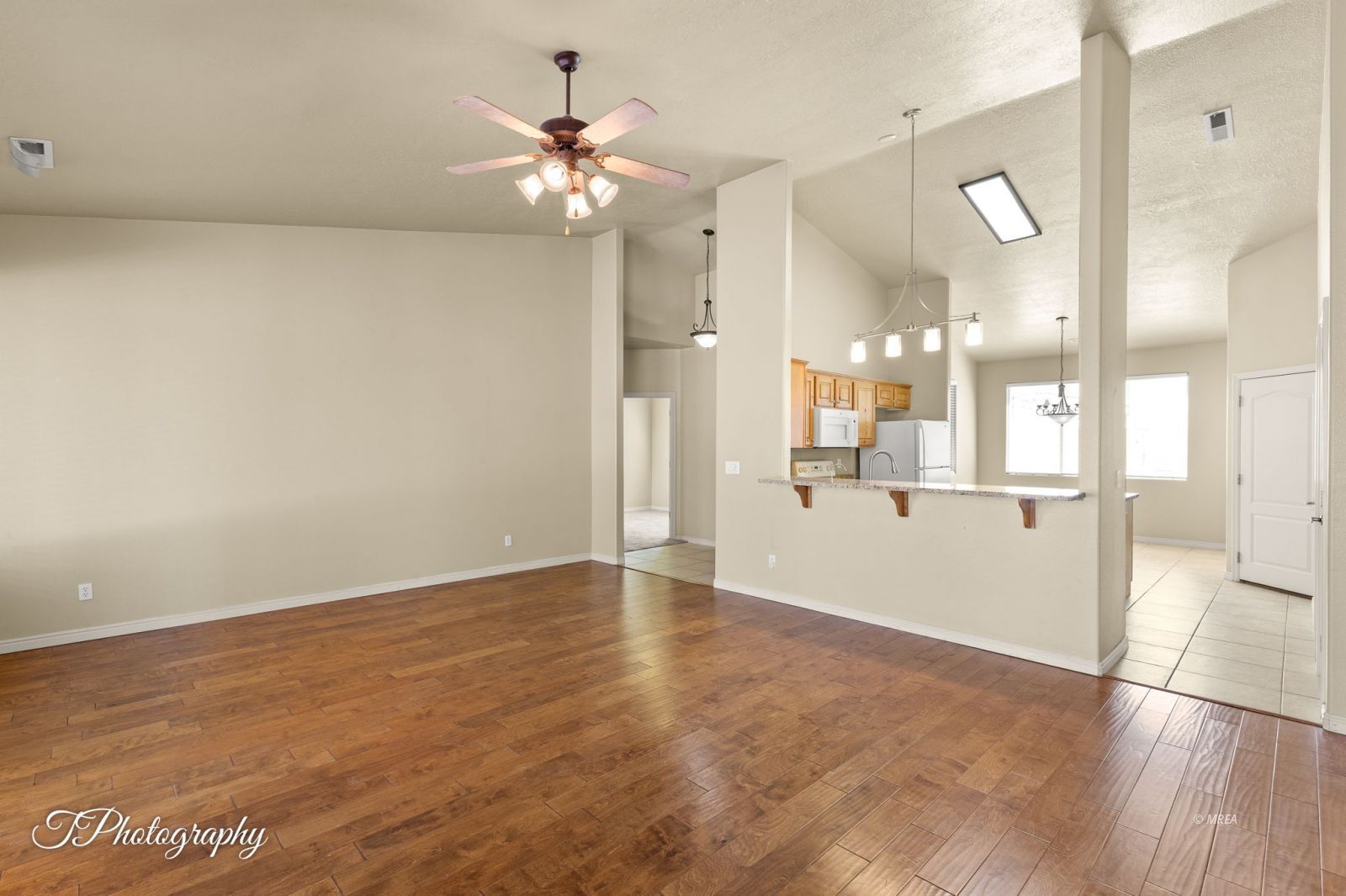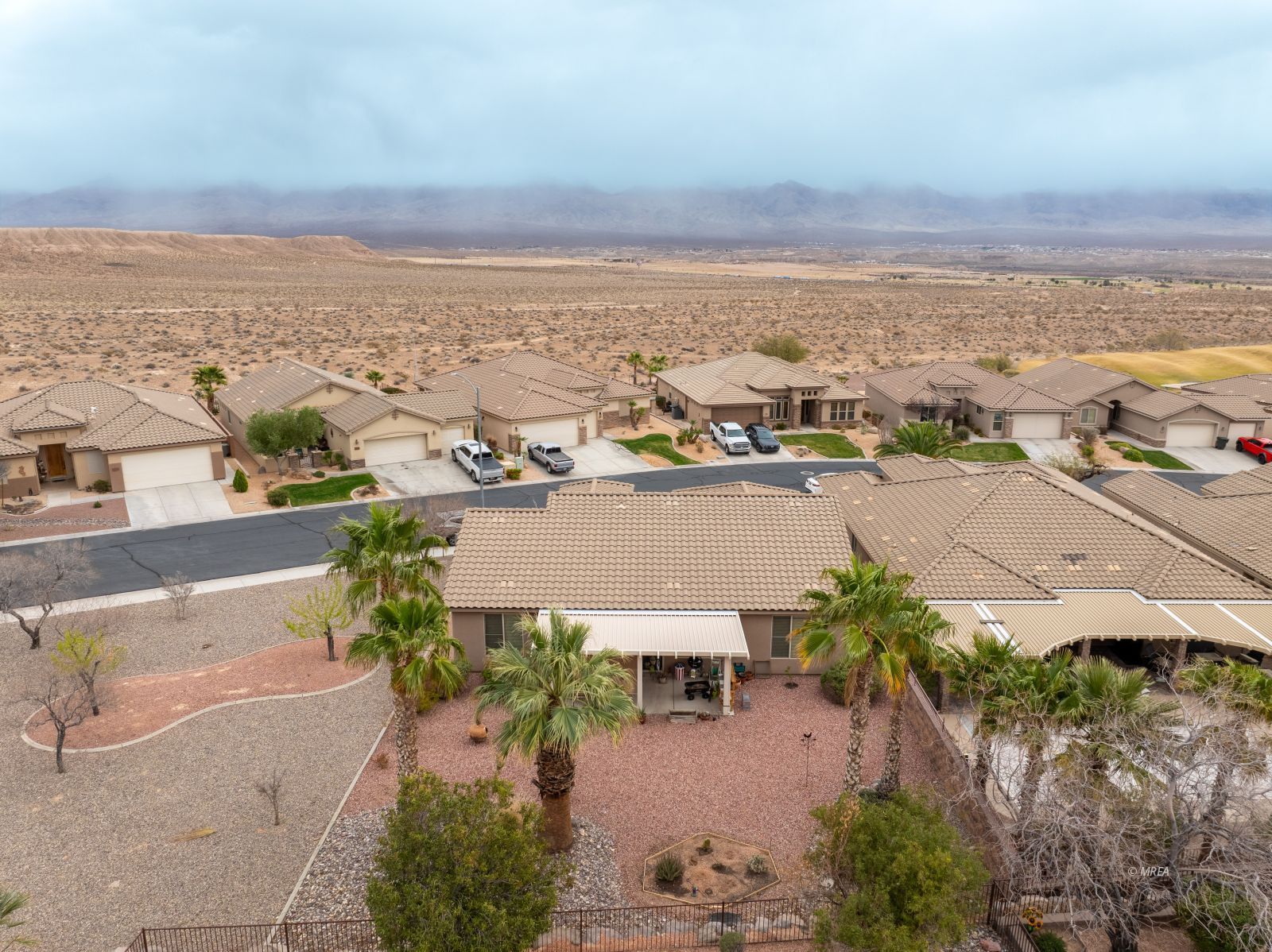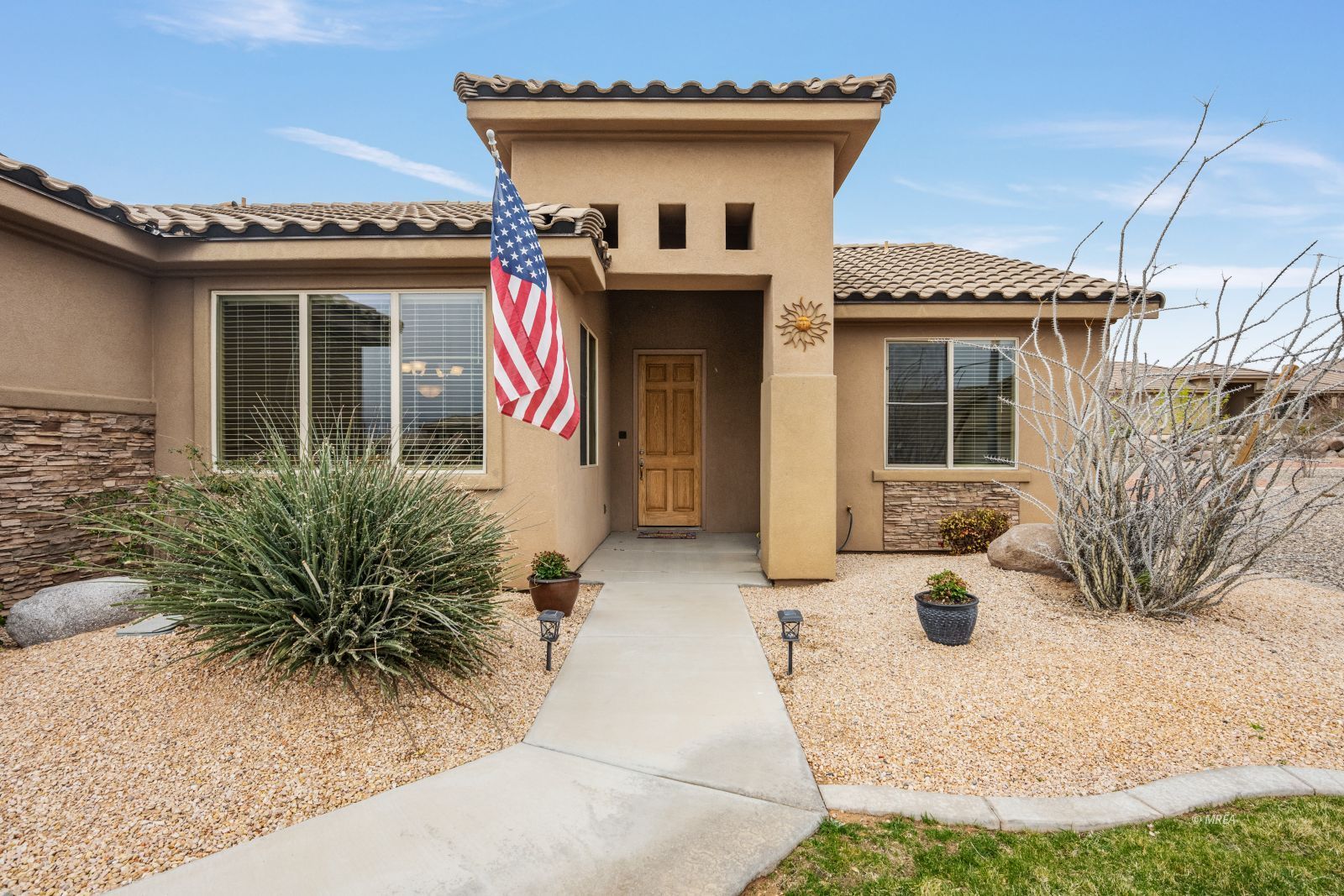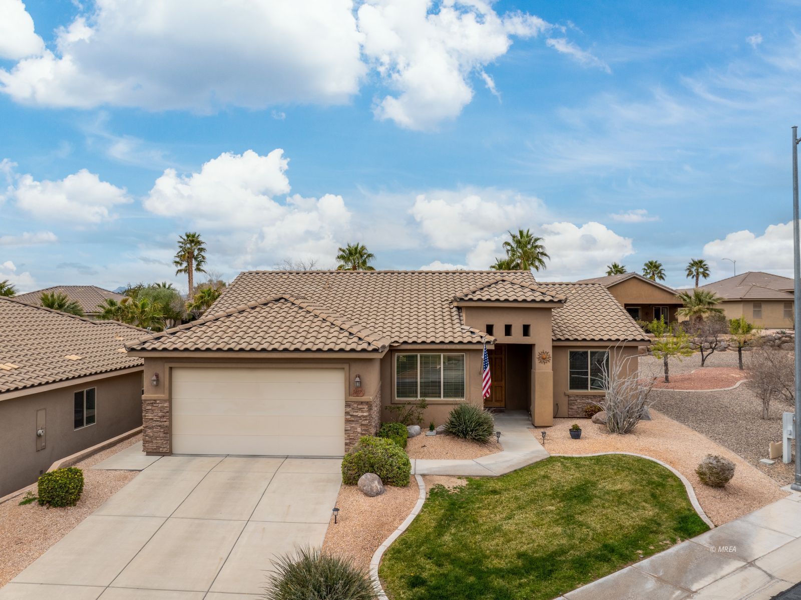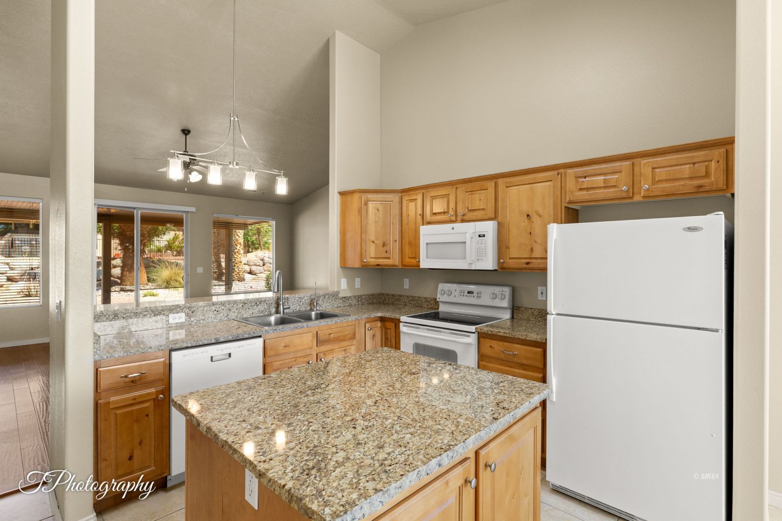 Welcome to this beautiful corner-lot home in the gated golf course community of Vista Del Monte in Mesquite, NV. Featuring 3 bedrooms, 2 bathrooms, and a 2-car garage, this home blends style with functionality. The open floor plan and vaulted ceilings create a spacious feel, with engineered wood flooring in the living room adding warmth and charm. The kitchen stands out with knotty alder cabinets, granite countertops, a large island, pendant lighting, and a stainless steel sink with reverse osmosis system – refrigerator and built-in appliances included. The split layout offers privacy, with the large primary suite featuring a walk-in closet, walk-in shower, and garden tub, while the guest bedroom is located on the opposite side of the home. A well-equipped utility room provides upper and lower cabinets, washer, dryer, and water softener. Outdoor living is easy with a covered patio and drop-down shades, perfect for entertaining or relaxing. This home offers thoughtful upgrades in a premier golf course community.
