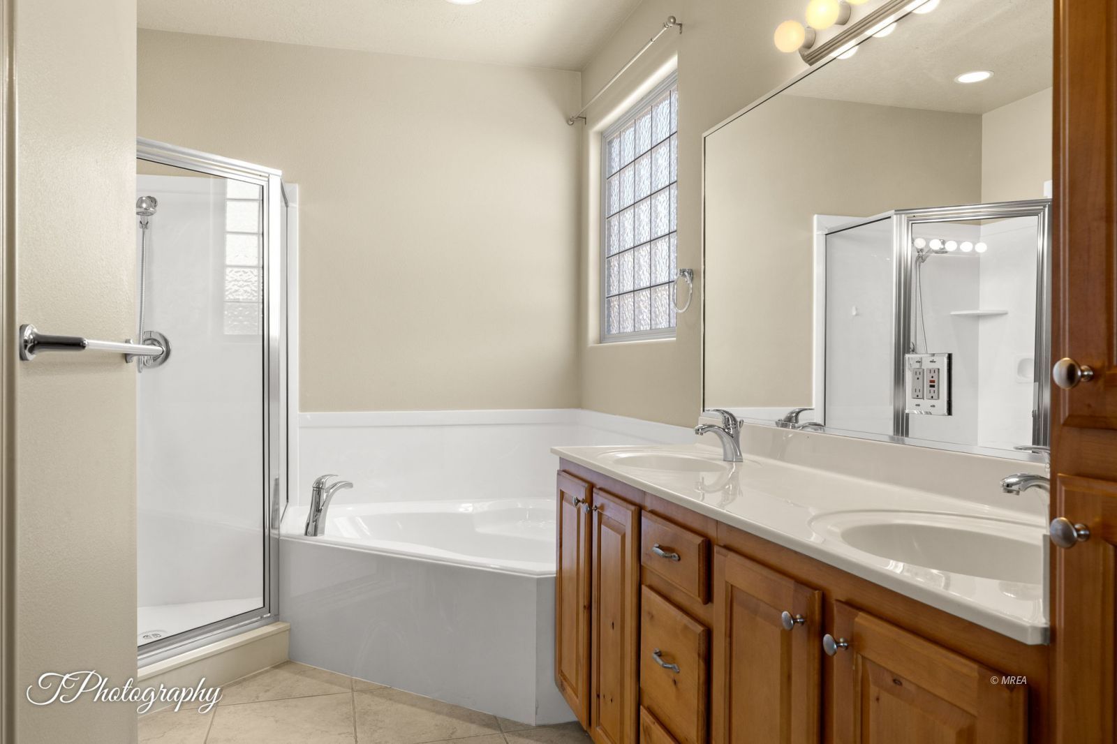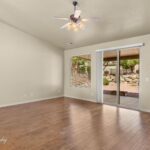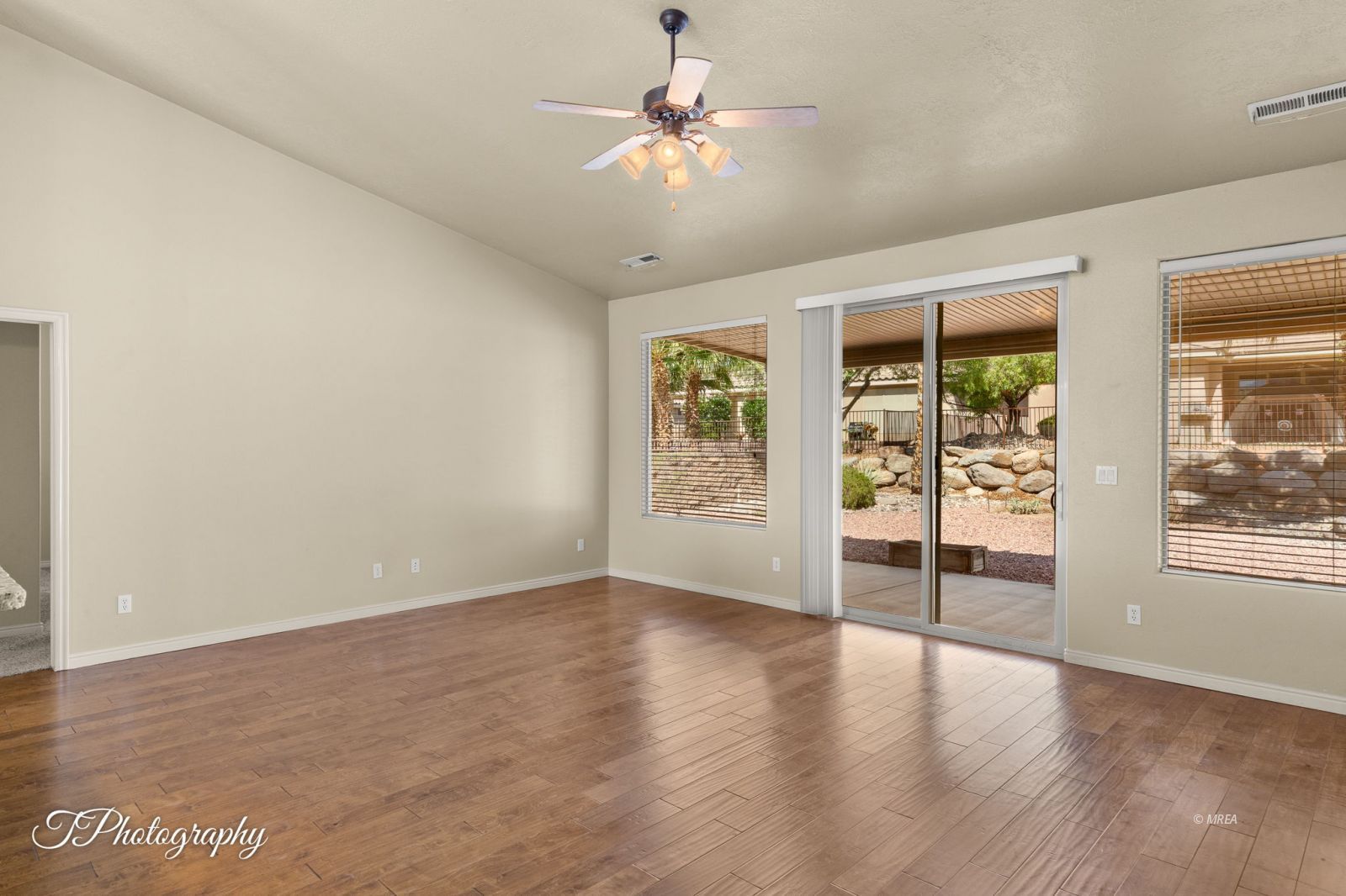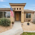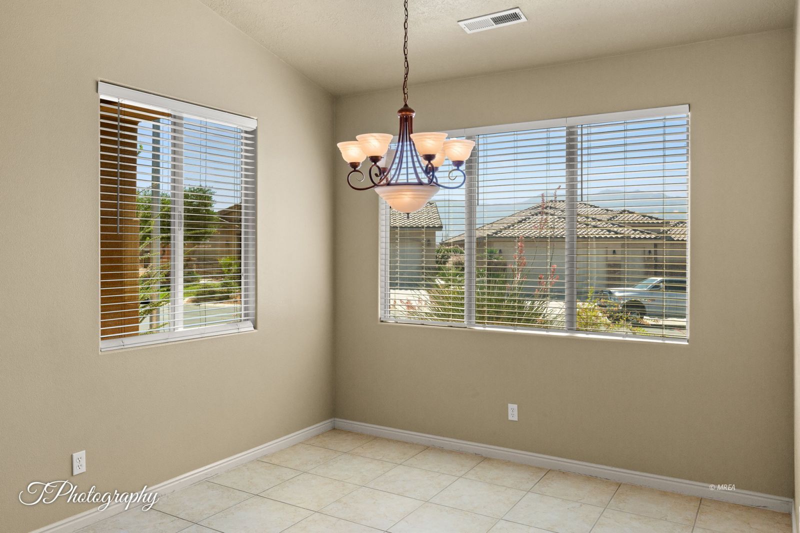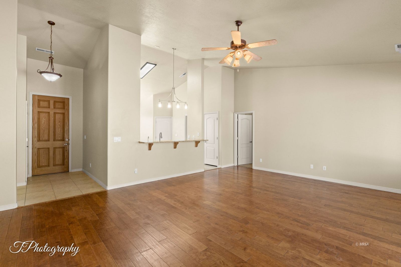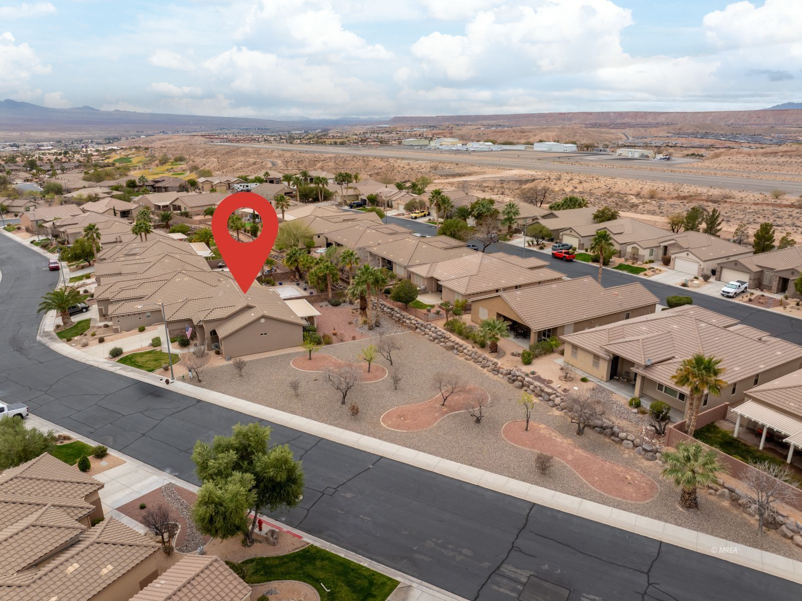 Welcome to this beautiful corner-lot home in the gated golf course community of Vista Del Monte in Mesquite, NV. Featuring 3 bedrooms, 2 bathrooms, and a 2-car garage, this home blends style with functionality. The open floor plan and vaulted ceilings create a spacious feel, with engineered wood flooring in the living room adding warmth and charm. The kitchen stands out with knotty alder cabinets, granite countertops, a large island, pendant lighting, and a stainless steel sink with reverse osmosis system – refrigerator and built-in appliances included. The split layout offers privacy, with the large primary suite featuring a walk-in closet, walk-in shower, and garden tub, while the guest bedroom is located on the opposite side of the home. A well-equipped utility room provides upper and lower cabinets, washer, dryer, and water softener. Outdoor living is easy with a covered patio and drop-down shades, perfect for entertaining or relaxing. This home offers thoughtful upgrades in a premier golf course community.