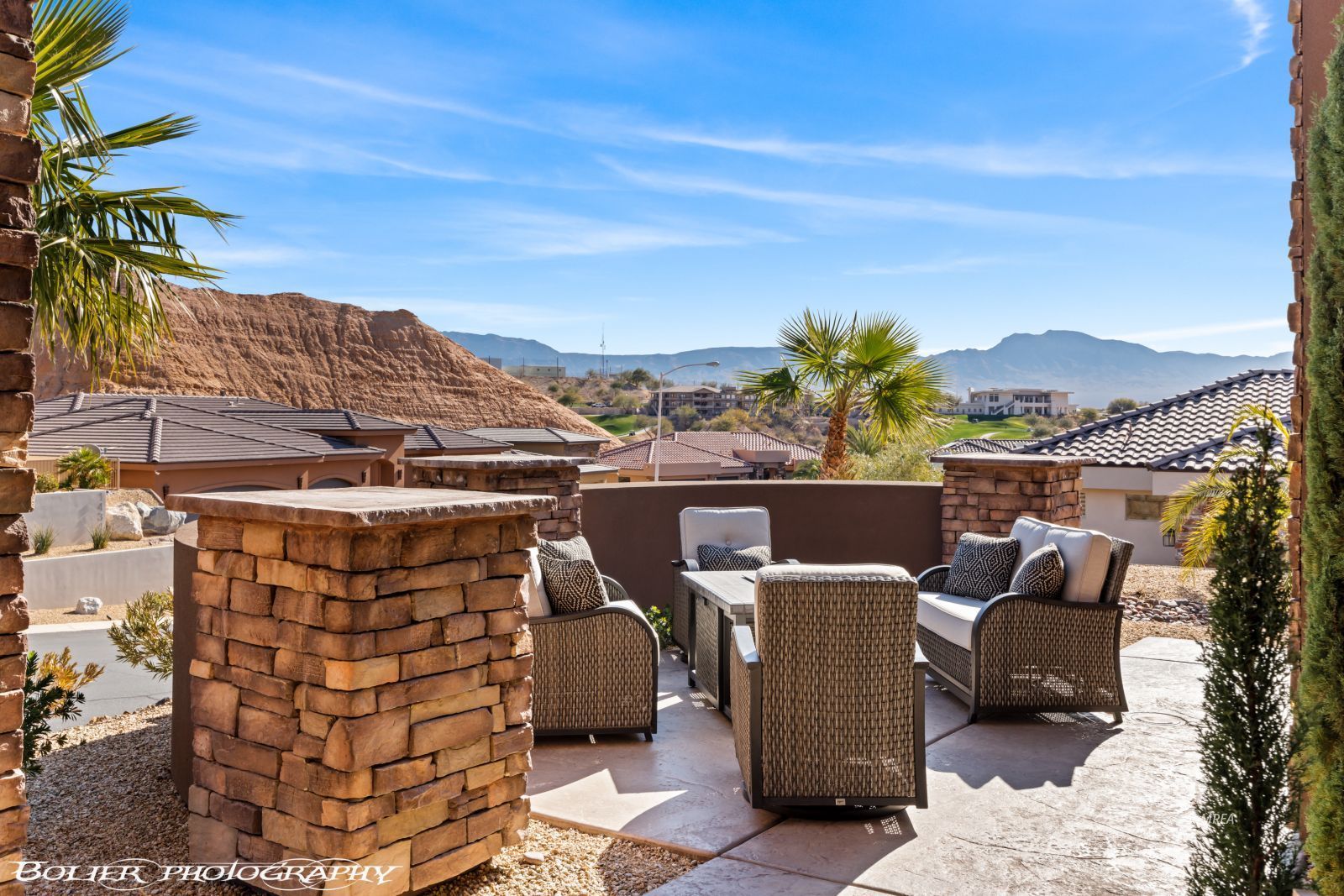 Welcome to this FULLY FURNISHED and ACCESSORIZED extraordinary desert retreat where timeless sophistication meets serene living. This custom home is located on a .27/acre home site in Bella Horizon, a highly sought after, gated community. Perched high above Mesquite, this opulent estate offers panoramic views of the majestic southern mountains, distant fairways and Flat Top Mesa. Expansive glass doors and windows open up to an outdoor Oasis with an impressive covered patio, sparkling swimming pool, built-in BBQ, colorful landscaping and seclusion. The front courtyard views Wolf Creek’s lush green fairways and the eastern mountains. The home is bold but understated and is meticulously appointed, masterfully designed and architecturally stunning. Every detail was carefully considered down to the luxurious bathroom surrounds, stunning floor tile, paint tones and lighting. The home has 3 spacious bedrooms, 2 with en-suite bathrooms and patio access, an office/den, fireplace, and soaring ceilings. The oversized 3 car garage spanning over 1,000/sf provides ample storage for vehicles, recreational equipment, and all those desert adventure toys. This home truly shows like Model.