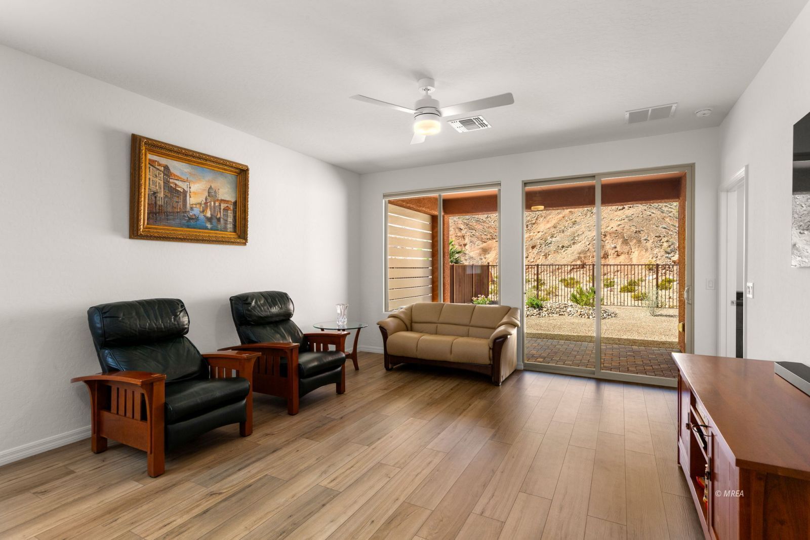 Welcome to this beautifully maintained 2-bedroom, 2-bathroom home with a 2-car garage, perfectly situated at the base of the breathtaking Flat Top Mesa. Enjoy incredible mountain views from both inside and out, providing a peaceful and scenic desert backdrop. Inside, you’ll find 1,282 sq ft of thoughtfully designed living space, featuring luxury vinyl plank flooring, ceiling fans, and custom blinds throughout for a modern, comfortable, and low-maintenance lifestyle. The kitchen is bright and inviting, with white cabinetry, granite countertops, a gas cooktop, and a window over the sink that fills the space with natural light. Whether relaxing indoors or stepping outside to take in the stunning surroundings, this home is move-in ready and impeccably cared for. The open layout and welcoming atmosphere make it perfect for both everyday living and entertaining. As part of the highly desirable Sun City Mesquite HOA, residents enjoy resort-style amenities including indoor and outdoor pools, a fitness center, pickleball and tennis courts, scenic walking trails, social clubs, and more-offering the ideal blend of relaxation, recreation, and community living.