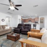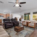 Move in ready and beautifully maintained, this spacious 2-bedroom home sits on a desirable north facing lot with a shaded backyard overlooking a natural stone wall and open desert common area and community park. The front of the home faces open space with sweeping vistas of the eastern mountains and western mesas, giving you stunning scenery in every direction. Step Inside to warm luxury vinyl plank flooring complements hat pairs perfectly with the soft brown kitchen cabinetry. The kitchen features granite countertops, stainless steel appliances, a spacious eat’in bar, and an open layout that flows seamlessly into the living area-ideal for everyday living and effortless entertaining. A large walk-in pantry adds excellent storage. The split bedroom layout places the guest room at the front and the main suite at the back, featuring a walk-in closet and ensuite bath with dual vanities, upgraded counters, and a walk-in shower. The extra-long 2 car garage includes a utility sink and water softener, with one side 28′ deep and the other 30.5′ for extra storage. Enjoy Flat Top Mesa views from the covered patio with extended pavers. Sun City offers Mesquite’s premier amenities and lifestyle