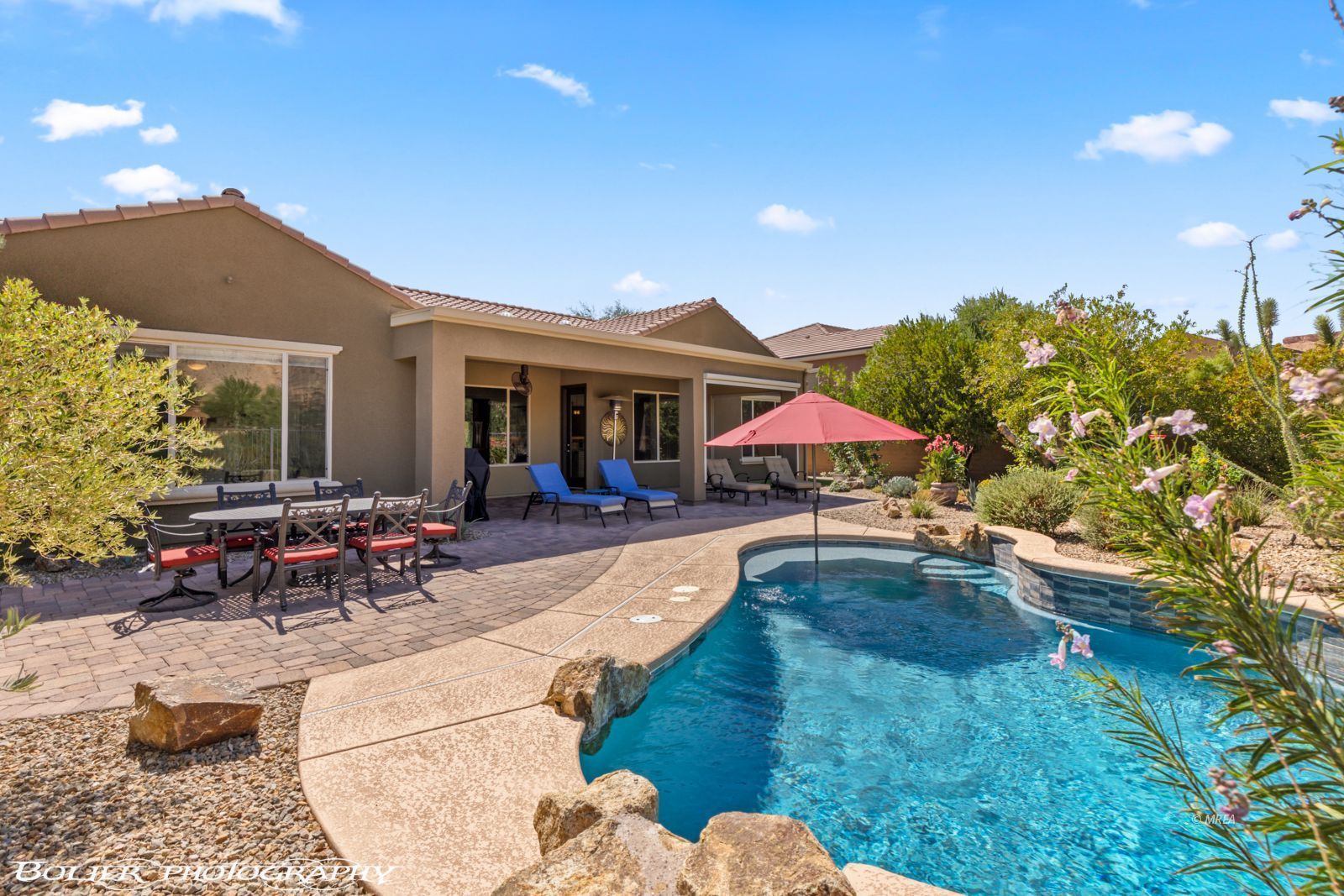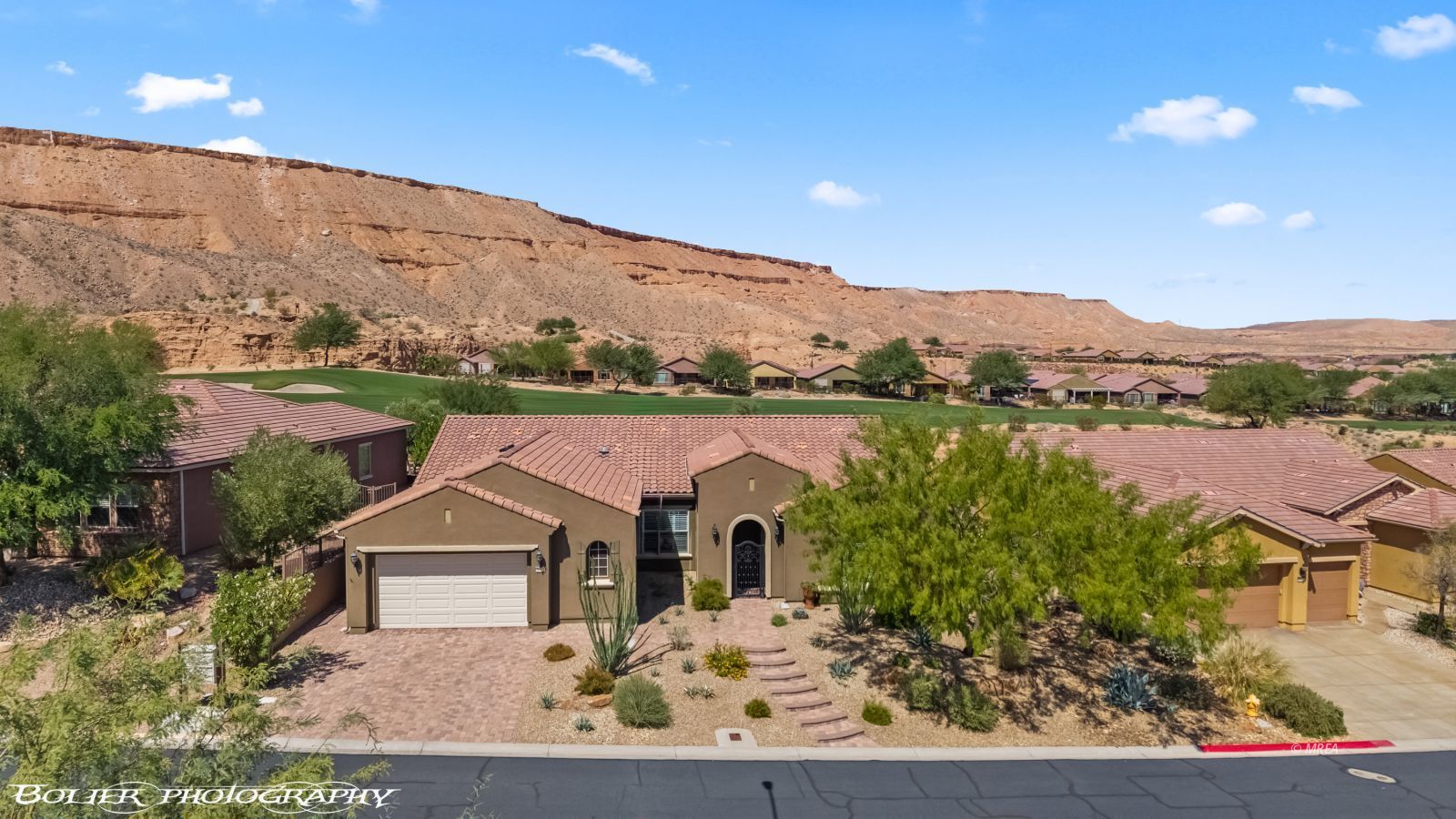 Ask about buyer’s awesome incentive being offered. Escape to luxury living in this stunning Sun City Mesquite home! This elegant residence, nestled in a sought-after gated community. Situated on a .25 acre homesite & backing a pristine fairway of the Conestoga Golf Course, the home boasts breathtaking views, distinctive landscaping & private swimming pool and a climate controlled 3 car garage. The expansive patio, complete with power shades, offers the perfect setting for entertaining or unwinding while taking in the tranquil golf course and desert views. The kitchen is gorgeous featuring an oversized, custom-built island full of cabinets, two ovens, single basin sink and dual refrigerators (one commercial-sized). This 3-bedroom home (2 owner’s suites) offers the ultimate in privacy with each bedroom having its own ensuite bathroom. The large, versatile den/office is a bonus, perfect for a game room or media center. Additional highlights include crown molding, costly solar tubes, a custom-built living room entertainment center, a large laundry room with a utility sink and plenty of storage. . For youtube video, copy past this link into your browser: https://youtu.be/eChpB3dt