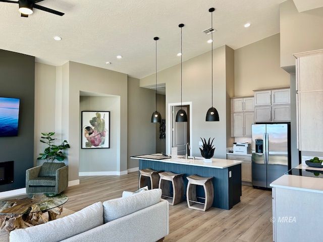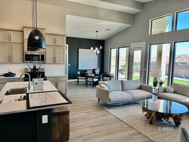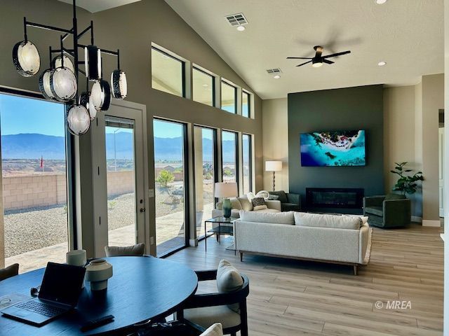 “THE GREAT MESQUITE EASTERLY VIEWS” Val Vista MODEL home 1947 sq ft with 3-bedrooms 3 -baths, 2 car garage with 49′ RV garage. This home is being sold FURNISHED. Features Include: very open plan with amazing easterly view of the virgin MT and north eastern desert, covered patio, quartz counter tops in kitchen and primary bathroom, Step and staggered shaker cabinets throughout home, Beautiful vinal flooring throughout the home, 60′ electric fireplace in living room, Landscaped front & backyard w/putting green, Builder would like to rent back for approx. 6 months at $1900.