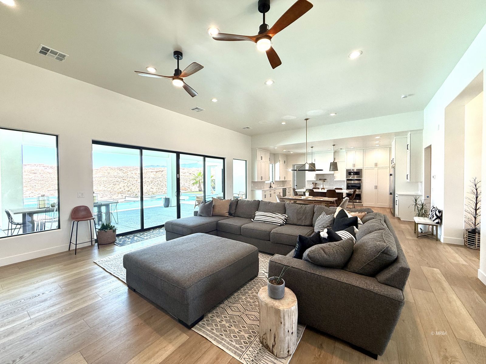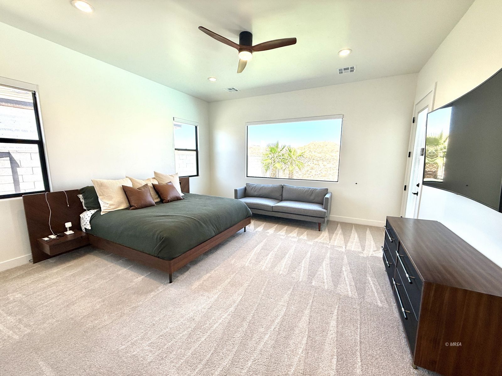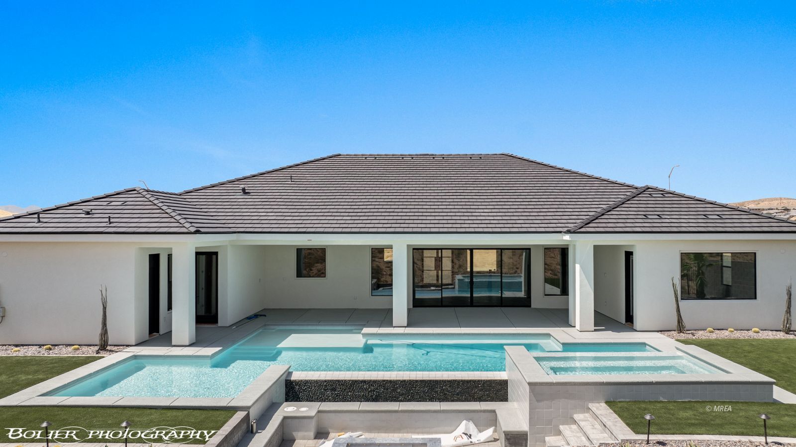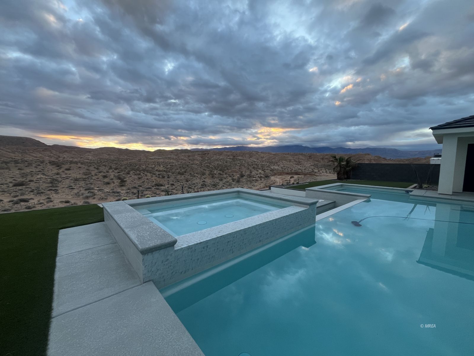 Custom home in desirable Mesquite, Nevada. This home is located in a quiet cul-de-sac with an unobstructed view of breath taking desert mountains. The outside entry has lighted steps that lead to a smart clear -opaque glass door. Enjoy the rising sun in your backyard with magnificent colors and shaded patio in the evening to enjoy your pool, over sized hot tub, and waterfall from the pool as you gather around the fire pit. This is truly one of a kind. The main floor features an open concept with smart appliances and commercial refrigerator. The hidden pantry is spacious and the island accommodates seating. The main bedroom opens to the patio and pool. The bathroom has double sinks, a large shower, and a custom closet. Three bedrooms are located on the opposite side of the house giving the main bedroom privacy. Bedroom 2 and 3 share a Jack and Jill bathroom while the 4th bedroom has a bathroom with access to the patio and pool. The basement is completely finished with a large family room, a guest bedroom and bathroom. There is also a large storage room downstairs. There is a double garage on one side of the house with an over sized garage on the opposite side of the house
