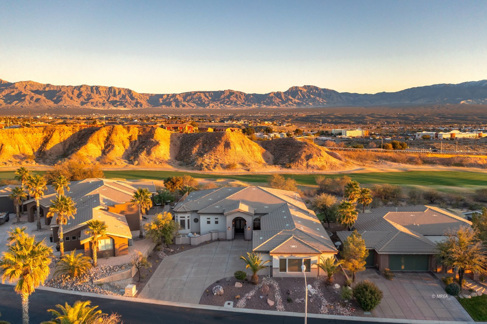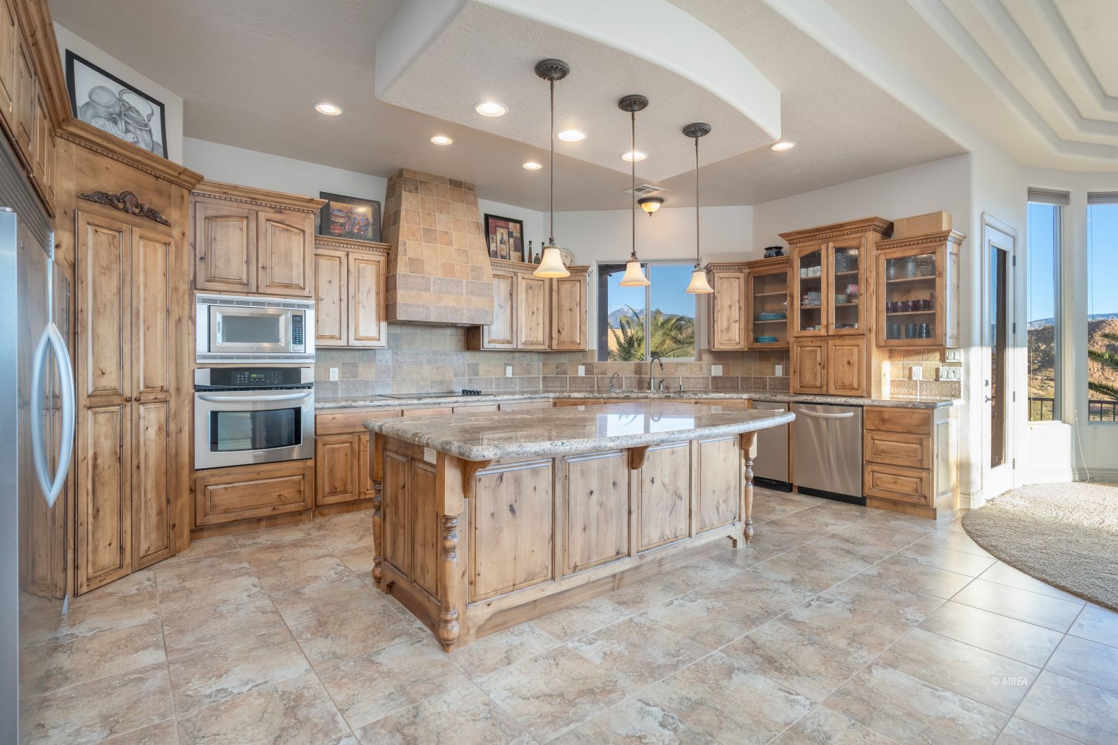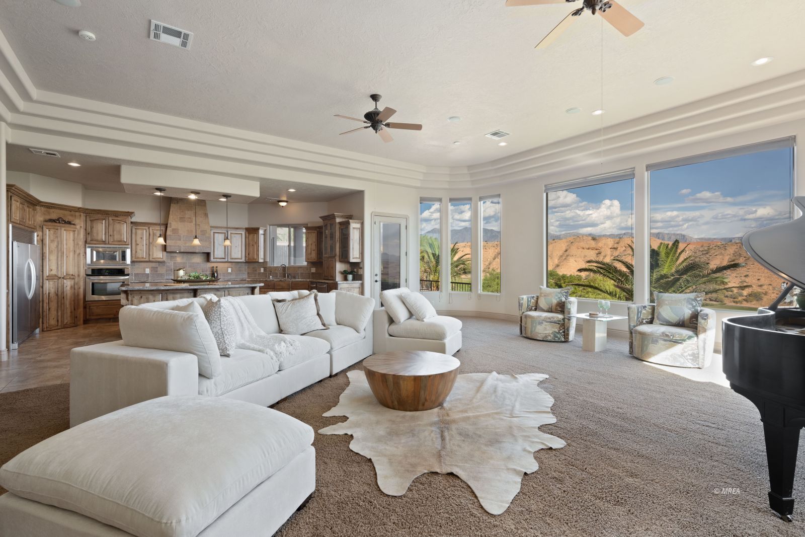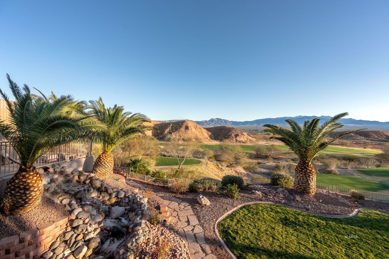 Introducing a masterpiece of luxury living nestled in the heart of Mesquite NV on the18th fairway of The Canyons Course in a favored gated community “Fox Hollow”. This exquisite home boasts unparalleled features, including a massive garage w/RV height door, home to your prized vehicles. Step inside to discover light-stained knotty alder cabinets, complemented by breathtaking granite countertops that adorn the massive gourmet Kitchen and luxurious spa like bathrooms. Entertain guests in front of the majestic rock fireplace, with great room to rival any theatre room. Vaulted ceilings give way to tall windows with spectacular views miles away or retreat to the tranquil backyard oasis large covered patios with shallow steps to lower level complete with a bubbling rock stream! Convenient ramp installed for access from the front yard as well. Outside, the lush landscape complimented with spacious grass yard sets the stage for unforgettable gatherings sitting high above the golf course and against the backdrop of a fluorescent mesa and panoramic mountain views. Experience the epitome of elegance and serenity in this remarkable residence. Welcome home to your ‘sanctuary’ in paradise