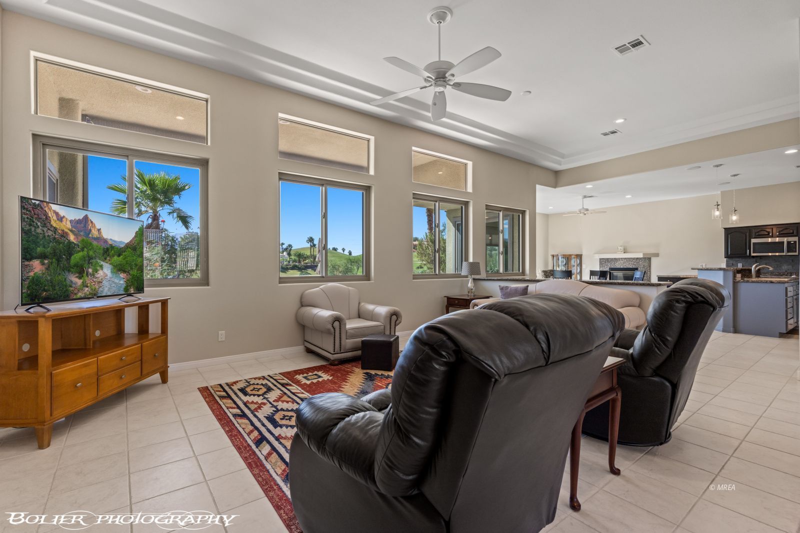 “Highly sought after….Highly desirable location in Mesquite” Offering sweeping views of the Virgin Valley mountains across the # 1 fairway of The Palmer Golf Course. Unique “low hoa of $53 per month” provides access to Mesquite Vistas Sports Center, offering the ultimate in amenities…swimming pool, hot tub, workout facility, pickleball courts, basketball courts, outdoor sand volleyball court, horseshoe pits and on site food services and beverages. Beveled Glass French Doors accent the entry to this beautiful residence. Living room has 11′ ceilings and large picture windows that showcase the natural beauty from this simply amazing location. Unique floor plan offers a fireplace that is centrally located between the dining area and the kitchen. Open living design has kitchen, dining area and living room all within view. New refrigerator, oven-range and microwave 2025. Main bedroom suite is impressively gracious in size. Main Bathroom has new tiled walk-in shower and tile surround soaking tub. Heat pumps replaced in 2018. Whole home replumbed in 2018. Replaced 8 back house windows and sliding doors with Anderson Windows. Three Car Garage.