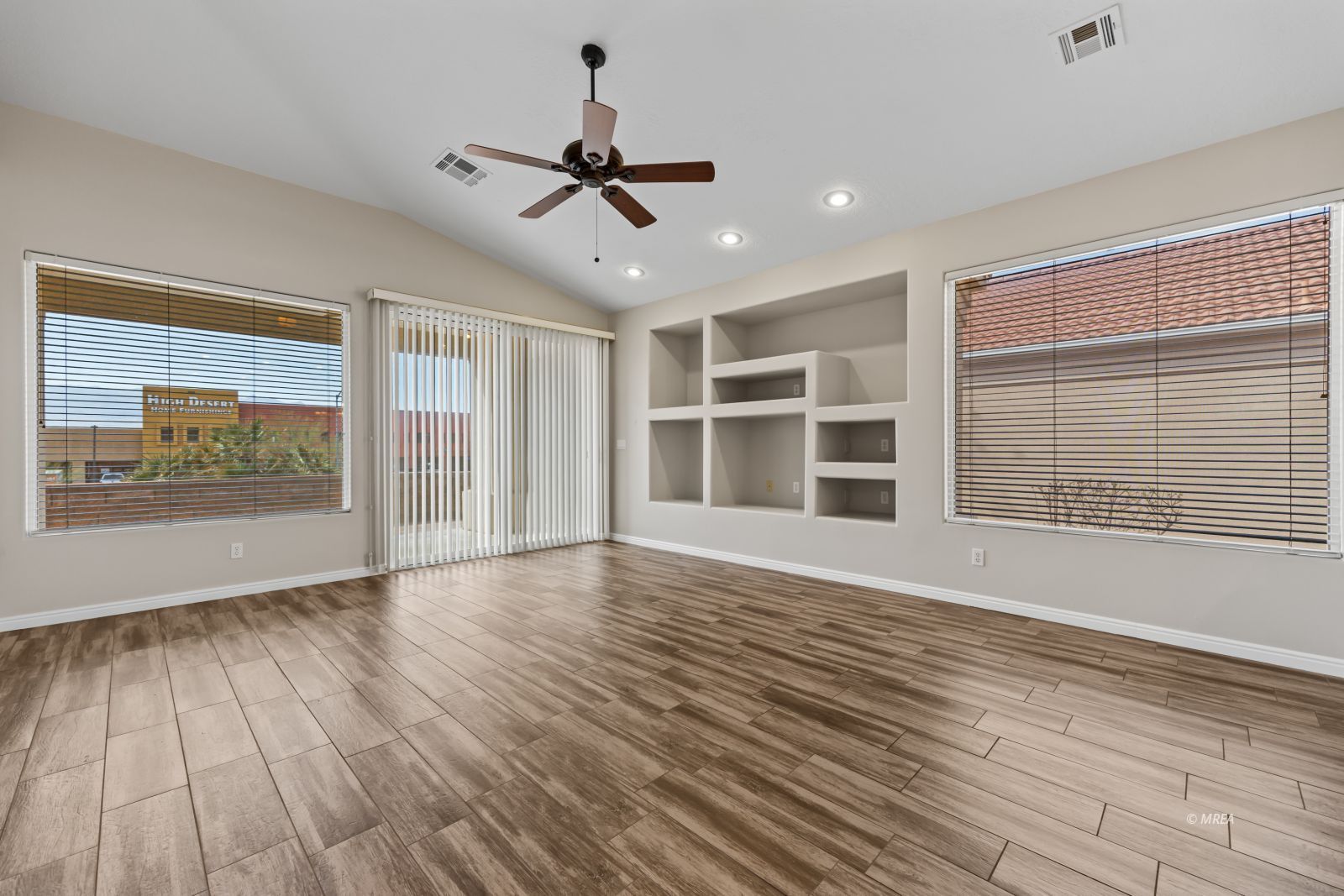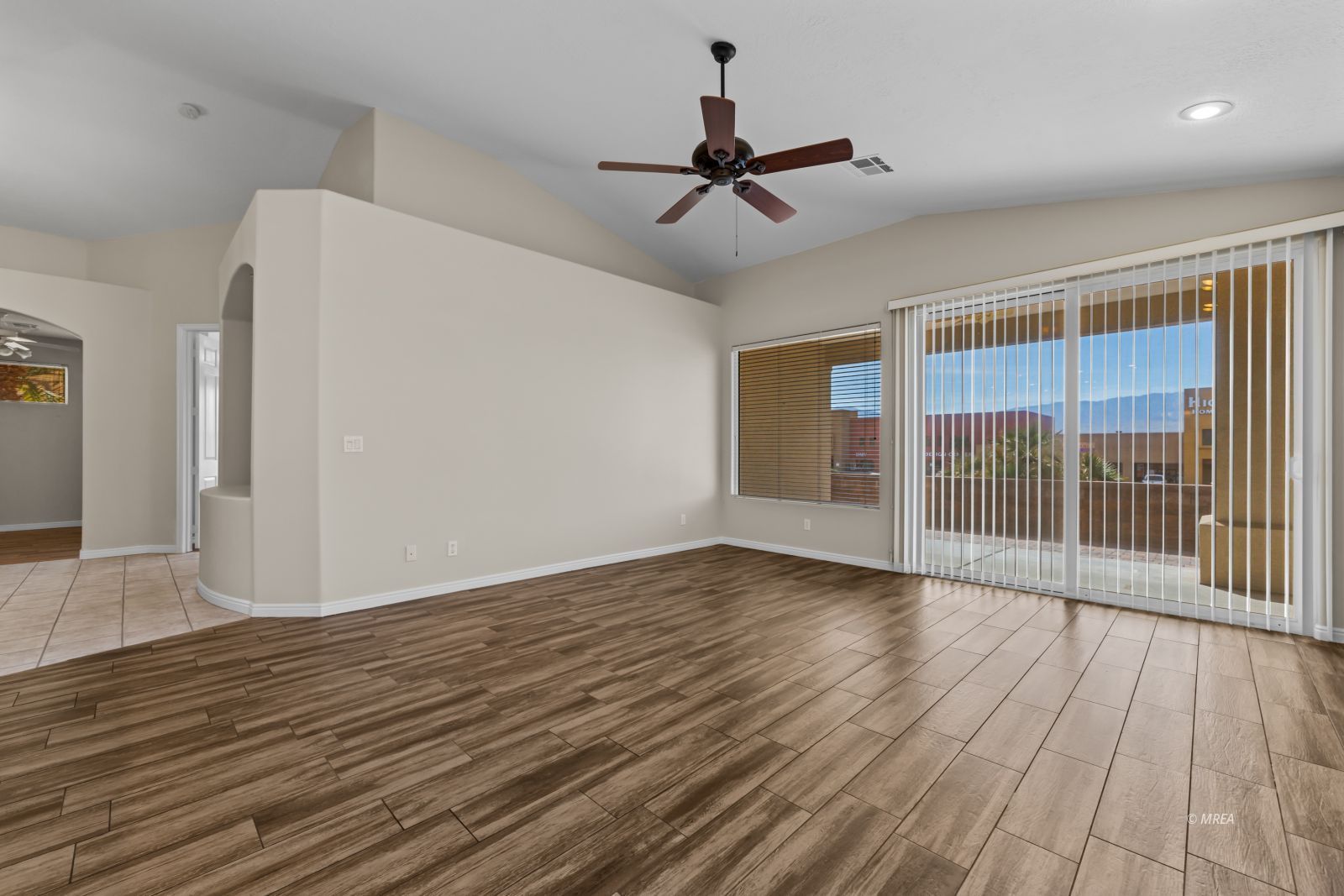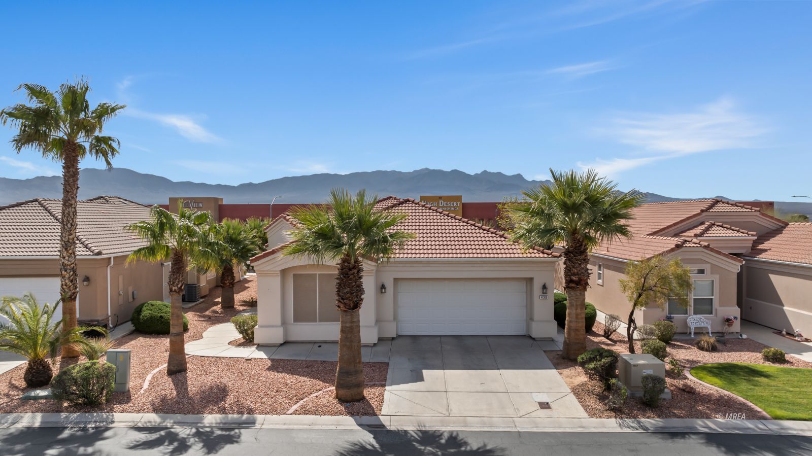 This inviting home features an open, airy layout with vaulted ceilings and a neutral color palette that creates a bright and comfortable atmosphere throughout. Durable tile and vinyl flooring provide both style and easy maintenance.The spacious great room flows seamlessly through the main living areas, offering an open feel that’s perfect for relaxing or entertaining. A versatile den provides the ideal space for a home office, hobby room, or additional sitting area. Step outside and enjoy the peaceful surroundings with two covered patios-one just off the great room and another private patio outside the primary bedroom, perfect for morning coffee or unwinding in the evening. Located in a well-maintained gated HOA community, residents enjoy access to fantastic amenities including a clubhouse, pool, spa/hot tub, and tennis courts, making it easy to enjoy the Mesquite lifestyle year-round.