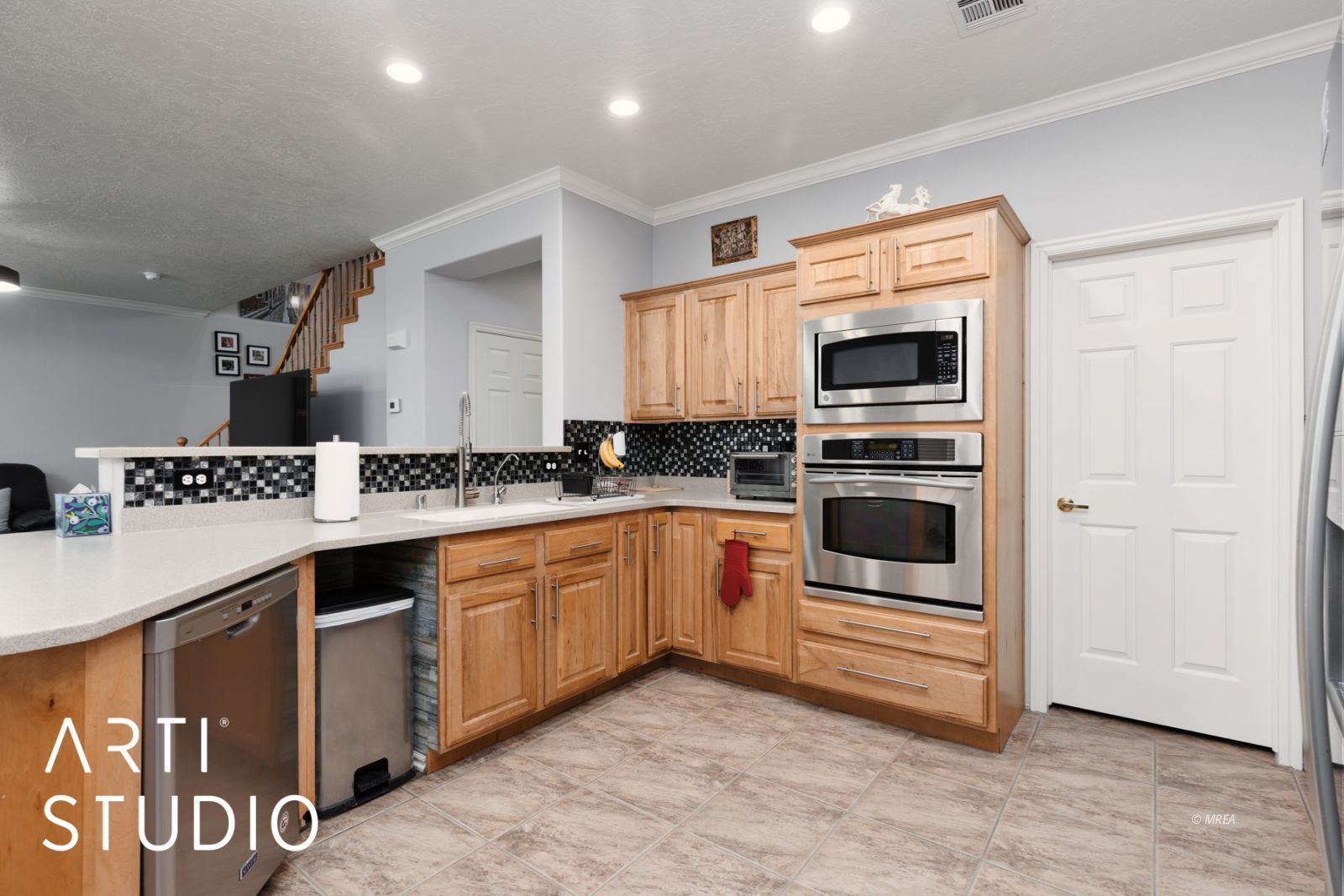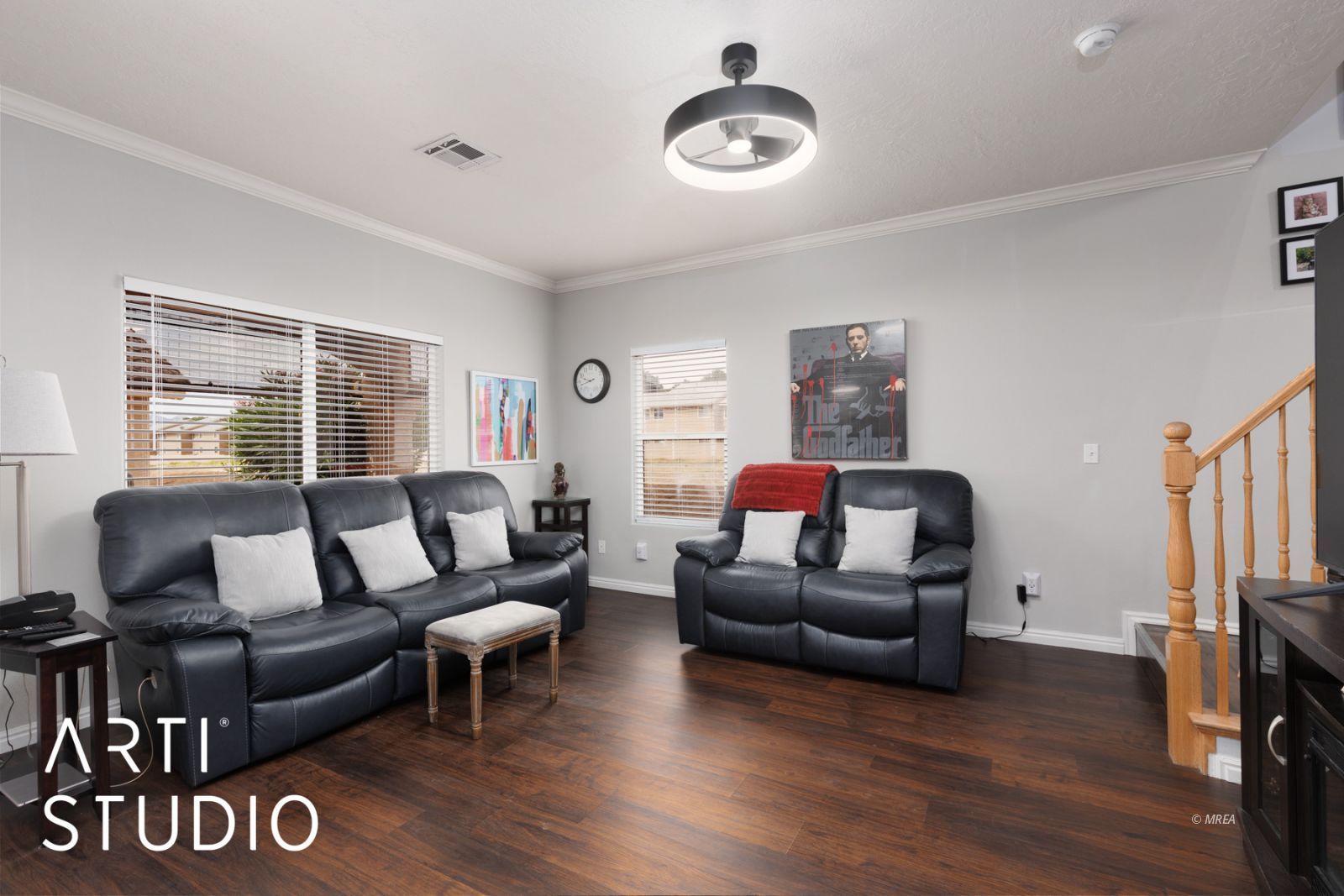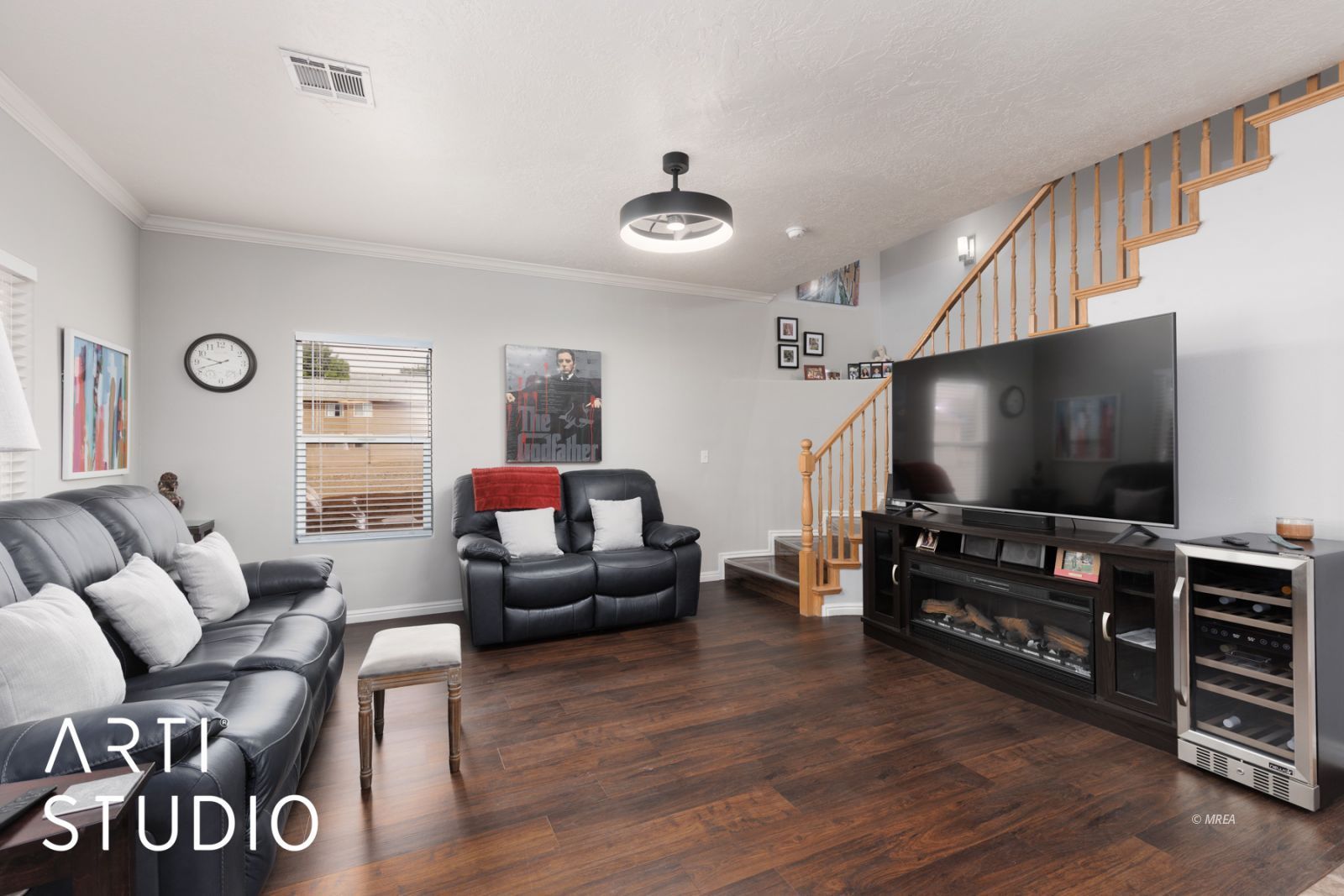 Welcome to Sandstone Condominiums, a gated and beautifully maintained community in the heart of Mesquite-just minutes from premier golf, shopping, and local parks. This spacious 2,738 sq ft townhome offers 4 bedrooms, 3.5 bathrooms, and an oversized 2-car garage with built-in cabinetry. All kitchen and laundry appliances remain at no extra cost, and the home is sold fully furnished. The upgraded kitchen includes Corian countertops, stainless steel appliances, a flat cooktop, reverse osmosis system, and a walk-in pantry. Dual primary suites-one on each level-feature walk-in closets, step-in showers, and dual vanities; the upstairs suite includes a deep, jetted tub. A private kitchenette is also located upstairs, ideal for added convenience. Additional highlights include an indoor elevator, laminate hardwood flooring, 16-inch tile in wet areas, solar-tinted windows, a large craft room with utility sink, new blinds throughout, all-new faucets, eight new ceiling fans, and new recessed lighting. Two covered outdoor spaces offer relaxing retreats. HOA amenities include a pool, spa, clubhouse, cable TV, and full yard maintenance. Come look for yourself.. Do not miss out!