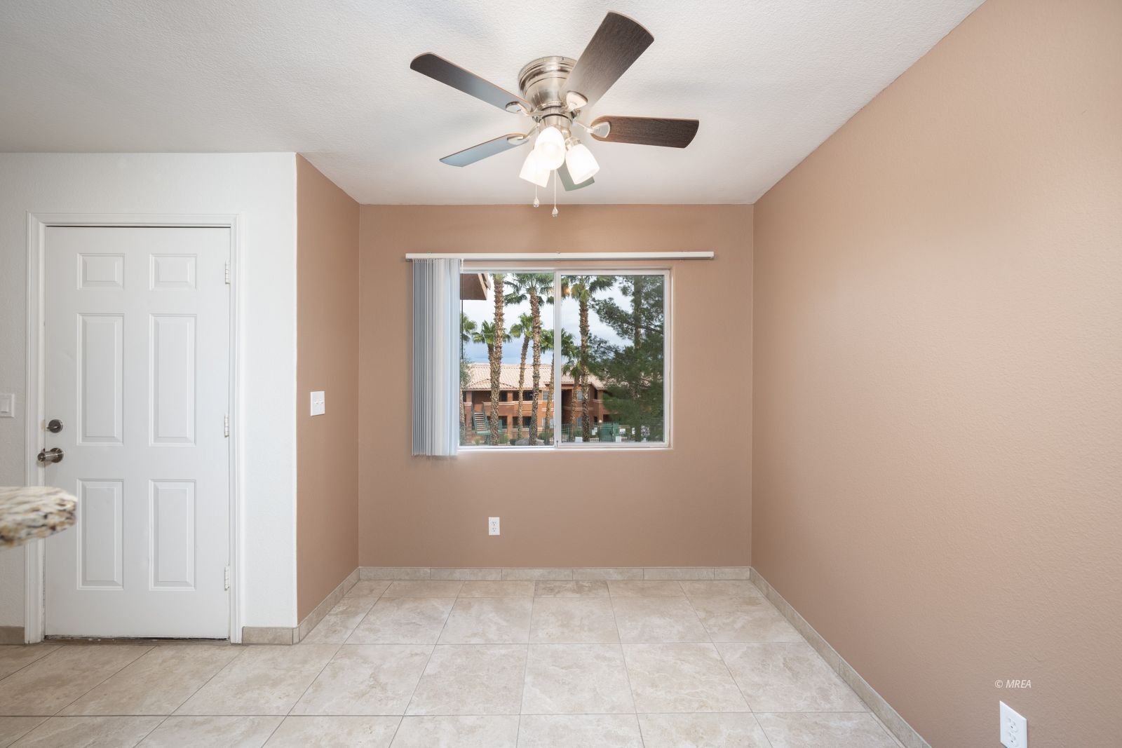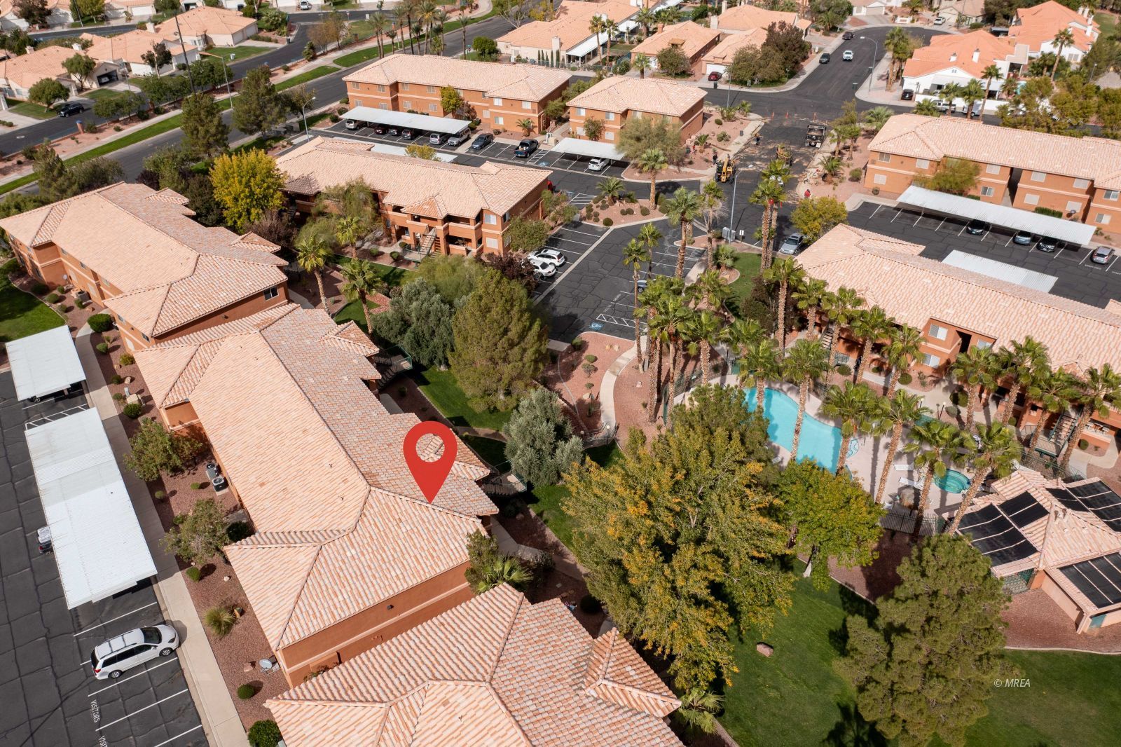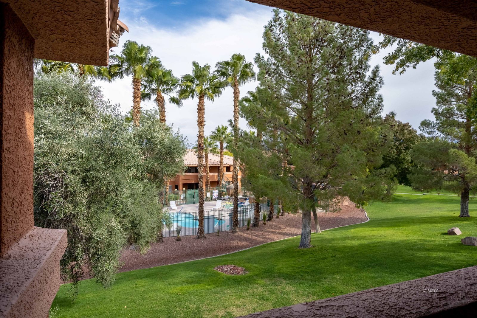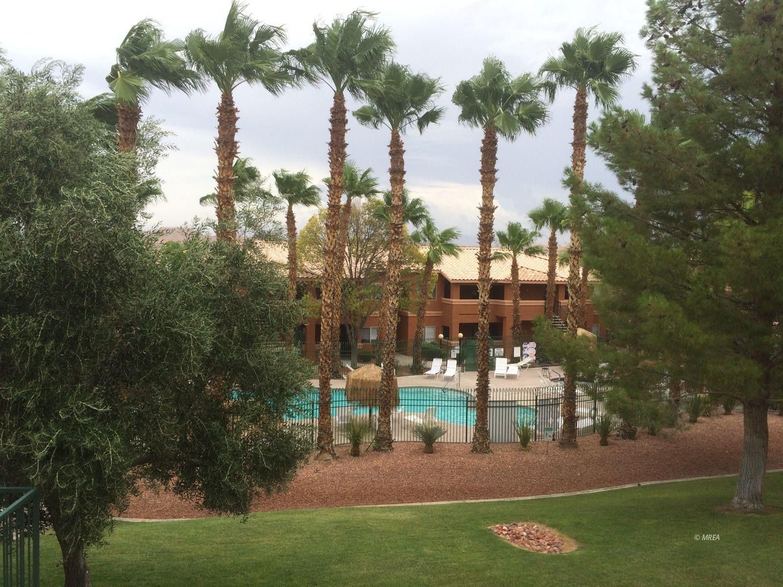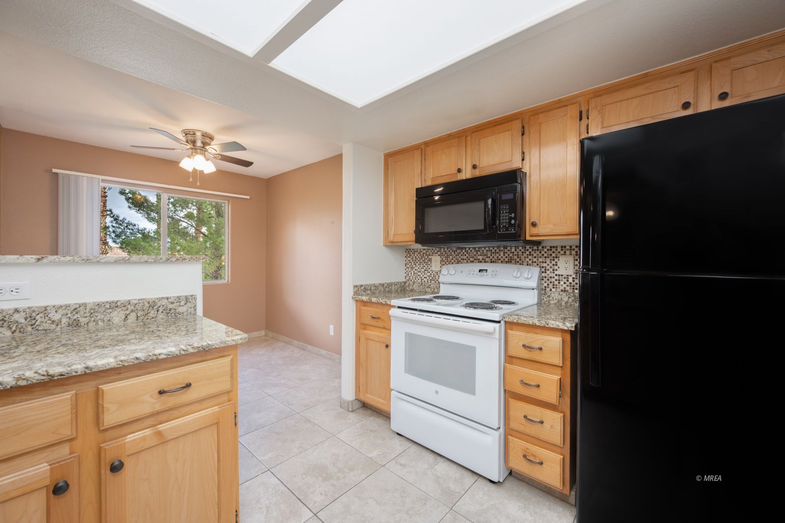 GREAT VIEW OF THE POOL and an unbeatable location! This well-maintained 1,166 sq. ft. Falls Condo offers 2 bedrooms and 2 bathrooms and is in excellent condition. A new AC unit installed in 2021 provides added comfort and peace of mind. The kitchen features granite countertops, an under-mounted sink, and all built-in appliances remain, including the refrigerator, washer, and dryer. The dining area and kitchen showcase 18″ tile flooring, with new Vinyl flooring in the living room and bedrooms. Ceiling fans, upgraded LED lighting, upgraded faucets, and new high-rise toilets enhance the home throughout. Enjoy abundant storage with multiple interior closets plus an additional storage closet on the front patio. A water softener is also installed. The spacious covered entry patio provides a welcoming outdoor space, and one covered parking spot is included. The HOA maintains the exterior and landscaping and features a beautiful cabana-style pool. As a member of The Falls Condominiums, owners also enjoy membership in Mesquite Vistas HOA, offering access to a swimming pool, recreation center, tennis courts, and additional amenities.