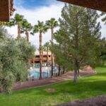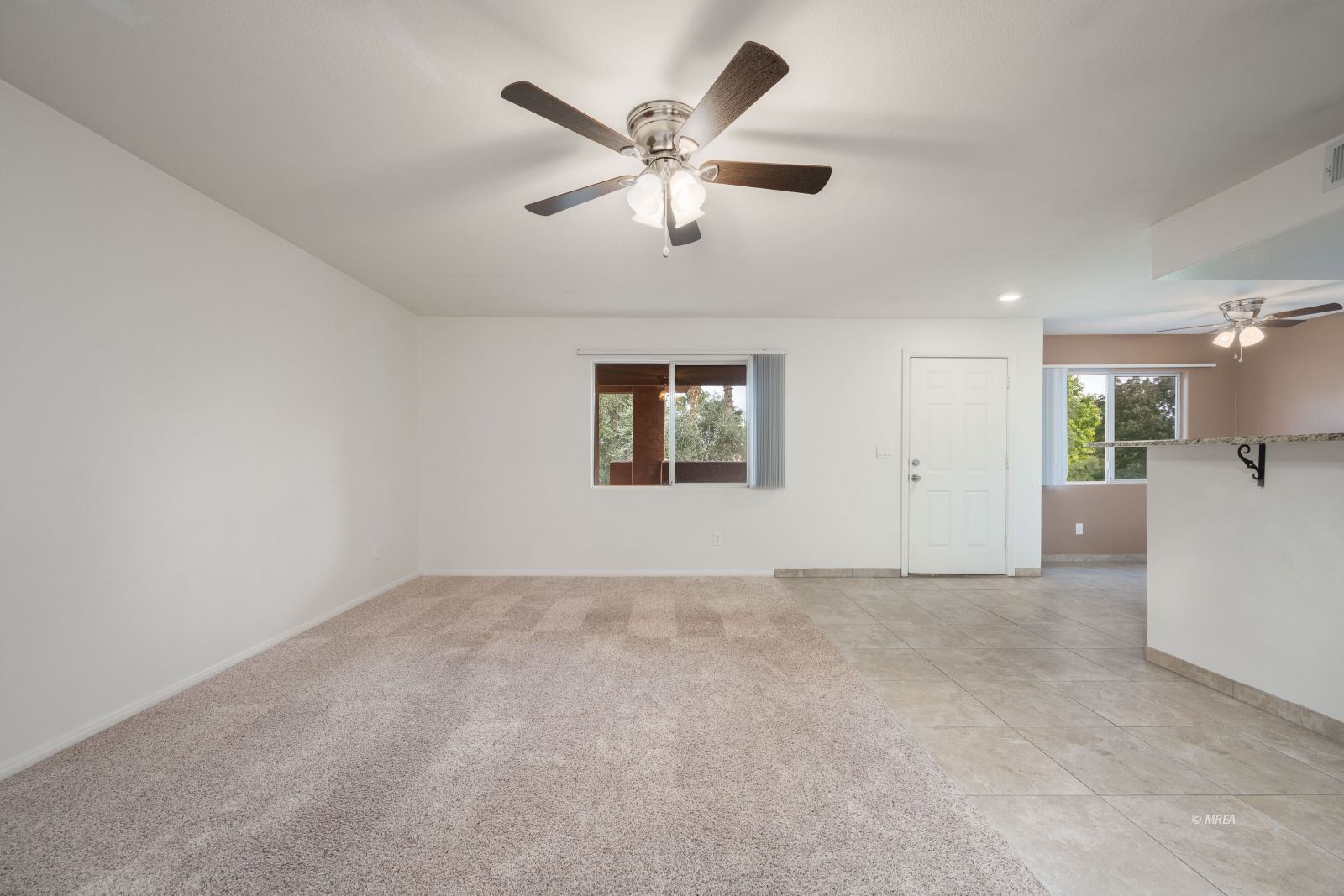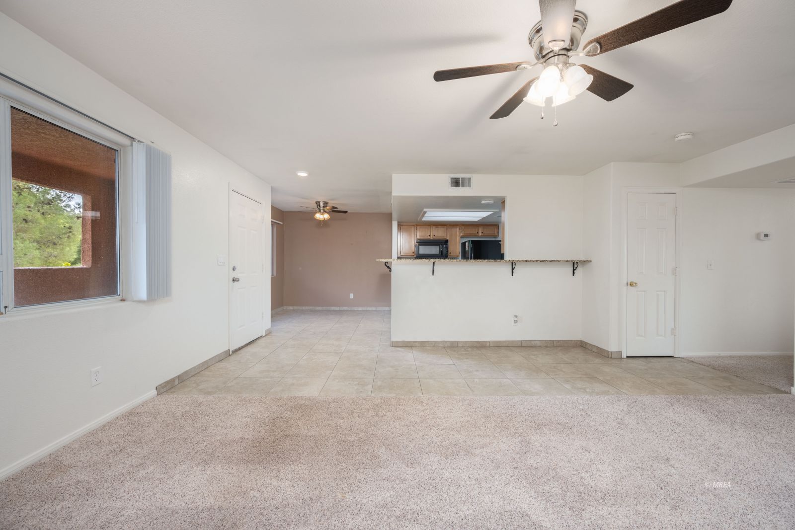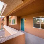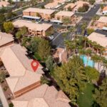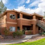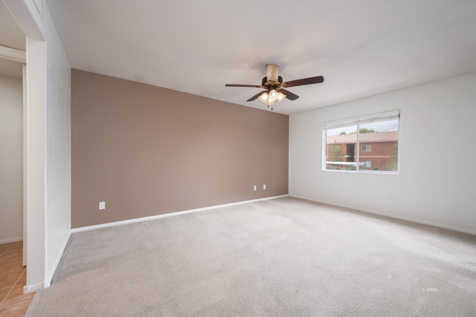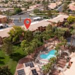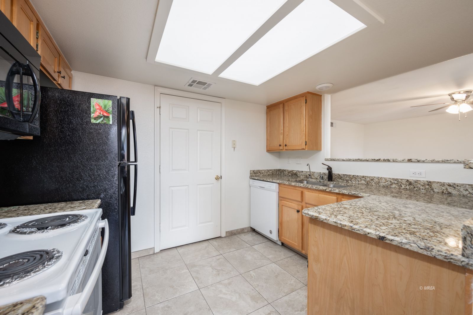 GREAT VIEW OF THE POOL and an unbeatable location! This well-maintained 1,166 sq. ft. Falls Condo offers 2 bedrooms and 2 bathrooms and is in excellent condition. A new AC unit installed in 2021 provides added comfort and peace of mind. The kitchen features granite countertops, an under-mounted sink, and all built-in appliances remain, including the refrigerator, washer, and dryer. The dining area and kitchen showcase 18″ tile flooring, with new Vinyl flooring in the living room and bedrooms. Ceiling fans, upgraded LED lighting, upgraded faucets, and new high-rise toilets enhance the home throughout. Enjoy abundant storage with multiple interior closets plus an additional storage closet on the front patio. A water softener is also installed. The spacious covered entry patio provides a welcoming outdoor space, and one covered parking spot is included. The HOA maintains the exterior and landscaping and features a beautiful cabana-style pool. As a member of The Falls Condominiums, owners also enjoy membership in Mesquite Vistas HOA, offering access to a swimming pool, recreation center, tennis courts, and additional amenities.