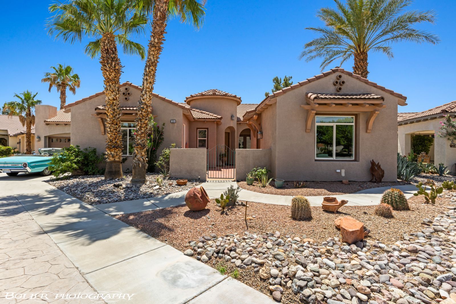 This rare, custom-designed 2,620 sq. Ft. Home on the Oasis Palmer Golf Course blends luxury, privacy, and stunning views. Perched on the 13th hole with little risk of stray golf shots, it offers a main bedroom with expansive bay windows showcasing mountain views, plus a Jack and Jill bath between a guest bedroom and den (convertible to a 3rd bedroom). The luxurious main bath features a custom-tiled large shower, dual vanities, and a spacious walk-in closet. The kitchen, perfect for entertaining, features beautiful cabinetry, custom counter tops, double ovens, and an abundance of windows offering natural light and sweeping views. The open-concept great room and formal living room with a wood-burning fireplace are ideal for gatherings. A welcoming front courtyard and a charming guest casita provide additional space. The over sized 770 sf. Garage offers ample storage. Located in a low-traffic cul-de-sac within sought-after Rancho Santa Barbara, this home includes access to the exclusive Mesquite Vistas Sports Club.