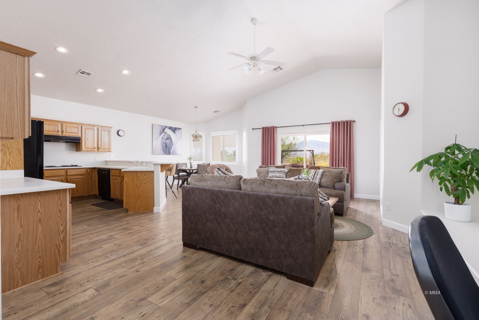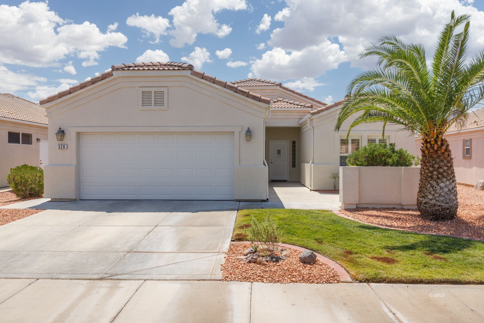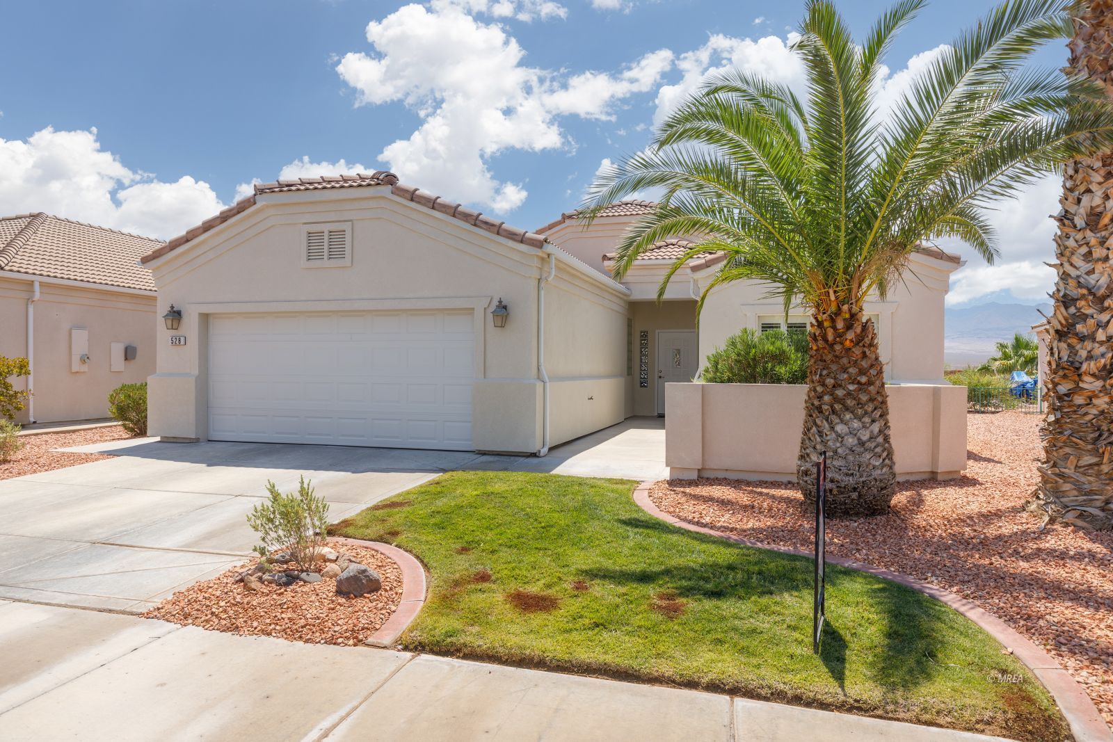 Welcome to your serene desert oasis in Mesquite, NV! Situated on a picturesque lot in a 55+ community, this beautifully maintained home offers panoramic views of the surrounding mountains and a meticulously landscaped yard with palm trees and vibrant natural flora.Inside, discover a spacious, open floor plan, featuring a modern kitchen with updated appliances, ample cabinetry, and breakfast bar, perfect for casual dining. The living area is accented by high ceilings and abundant natural light through large windows, providing a fresh and airy feel.This home boasts 2 cozy bedrooms and a den/office. The primary suite includes a private bathroom with dual vanities and a large spacious closet. A second bathroom and dedicated laundry room add to the home’s convenience and functionality.Step outside to the covered patio to simply relax and enjoy Mesquite’s stunning sunsets. With privacy, peace, and proximity to local amenities, this home is a remarkable find. Make it yours and embrace the blend of comfort and desert beauty!
