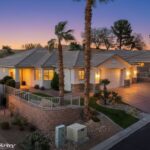Perched above the 4th green of the Falcon Ridge Golf Course, this exceptional home captures some of the most spectacular views on the block. From its elevated position, the backyard overlooks the putting green of Hole 4 with sweeping sightlines that stretch straight down the fairway. In the distance, you can even watch golfers tee off across the mesa at Hole 5, creating a truly unique and ever-changing landscape. Beyond the course, the scenery expands to include dramatic views of the Virgin Mountains and Mesquite’s iconic mesas, delivering sunsets that paint the desert sky in unforgettable color. Located within a gated active-adult community, the home combines scenery with comfortable living. Inside, a bright and open layout is designed to frame the surrounding views. The spacious kitchen features generous counter space, extensive cabinetry, a center island, separate bar area, and a cheerful dining nook. All appliances are included. Guest bedrooms provide comfortable accommodations, while the large laundry room includes additional storage and a utility sink. The property is completed by an oversized three-car garage with built-in cabinets. Come see!