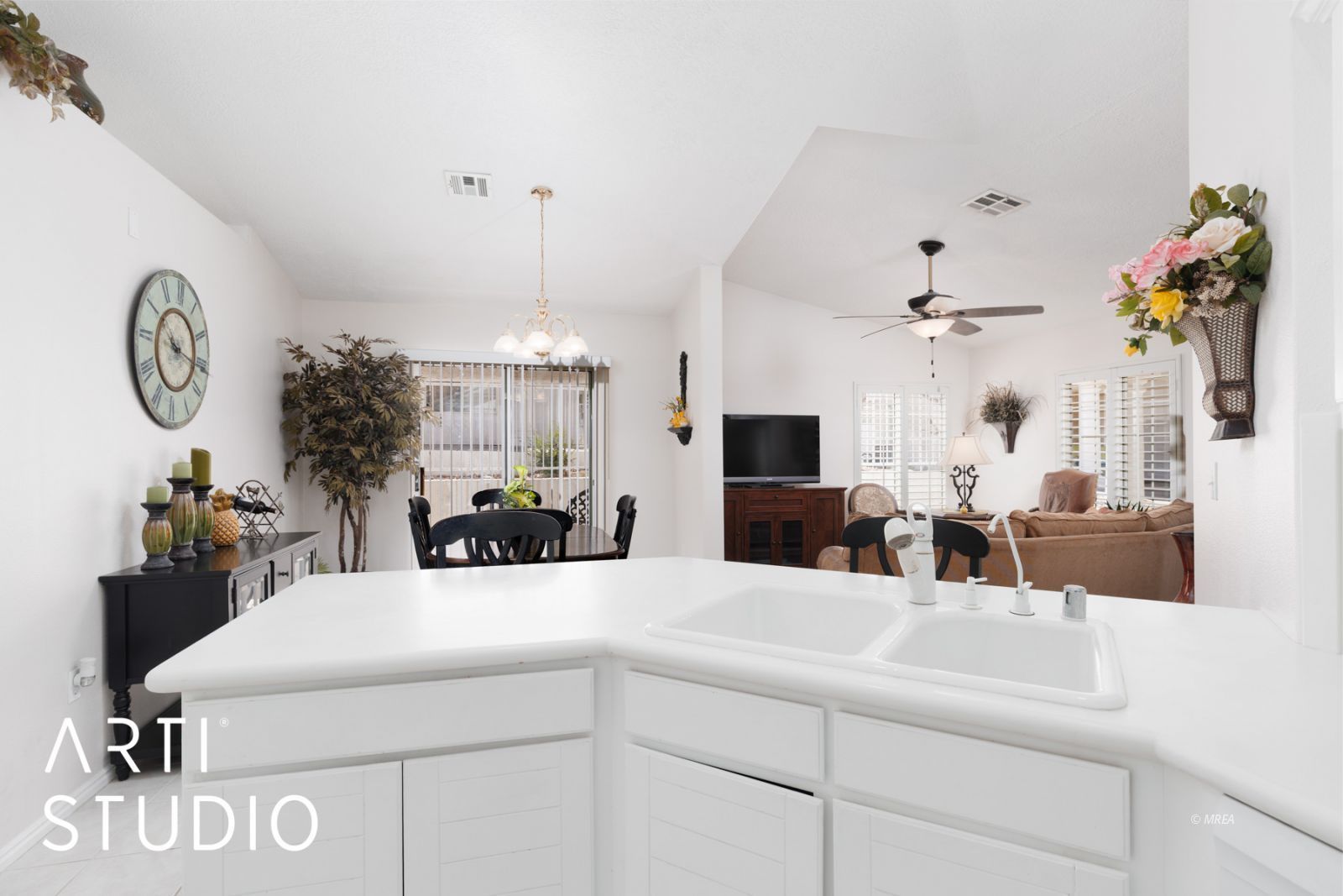 Welcome to this charming property located on the North Side of the I-15 in the sought-after Mesa Townhomes Subdivision, this 2-bedroom, 2-bath single-level property offers comfort, convenience, and value. The home features tile flooring in the main living areas and carpet in the bedrooms, ceiling fans in both bedrooms and the living room, plantation shutters throughout, and a functional layout. The kitchen includes white painted cabinets and all major appliances, which are included in the sale. The guest bathroom features a walk-in shower, while the primary suite has a tub-both with dual vanities for added convenience.The property includes a single-car detached garage and a separate storage unit located at the rear of the home that houses the water heater and water softener system. Outdoor living is enhanced with both a front patio and a covered side patio, and the home is just steps from one of two community pool and spa areas available to residents. The home can be sold fully furnished, offering a convenient, move-in ready option! This property is ideal for full-time living or a part-time retreat.. come see for yourself before it is gone!