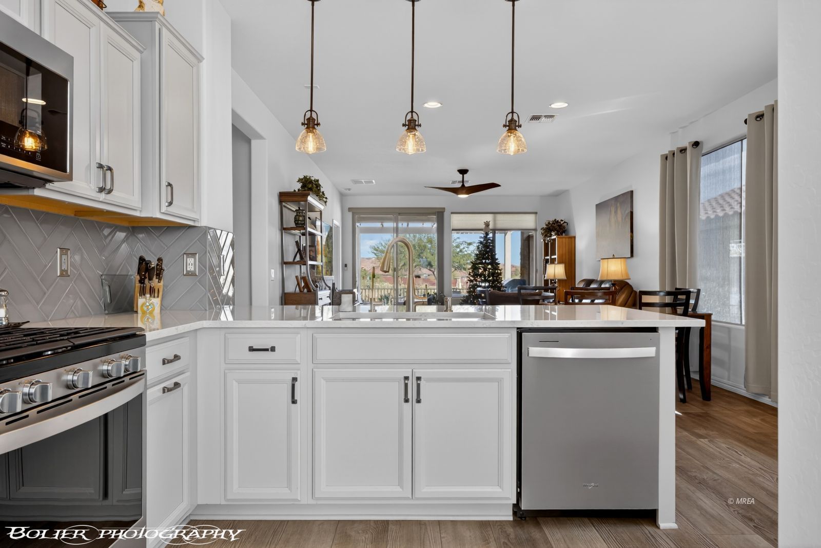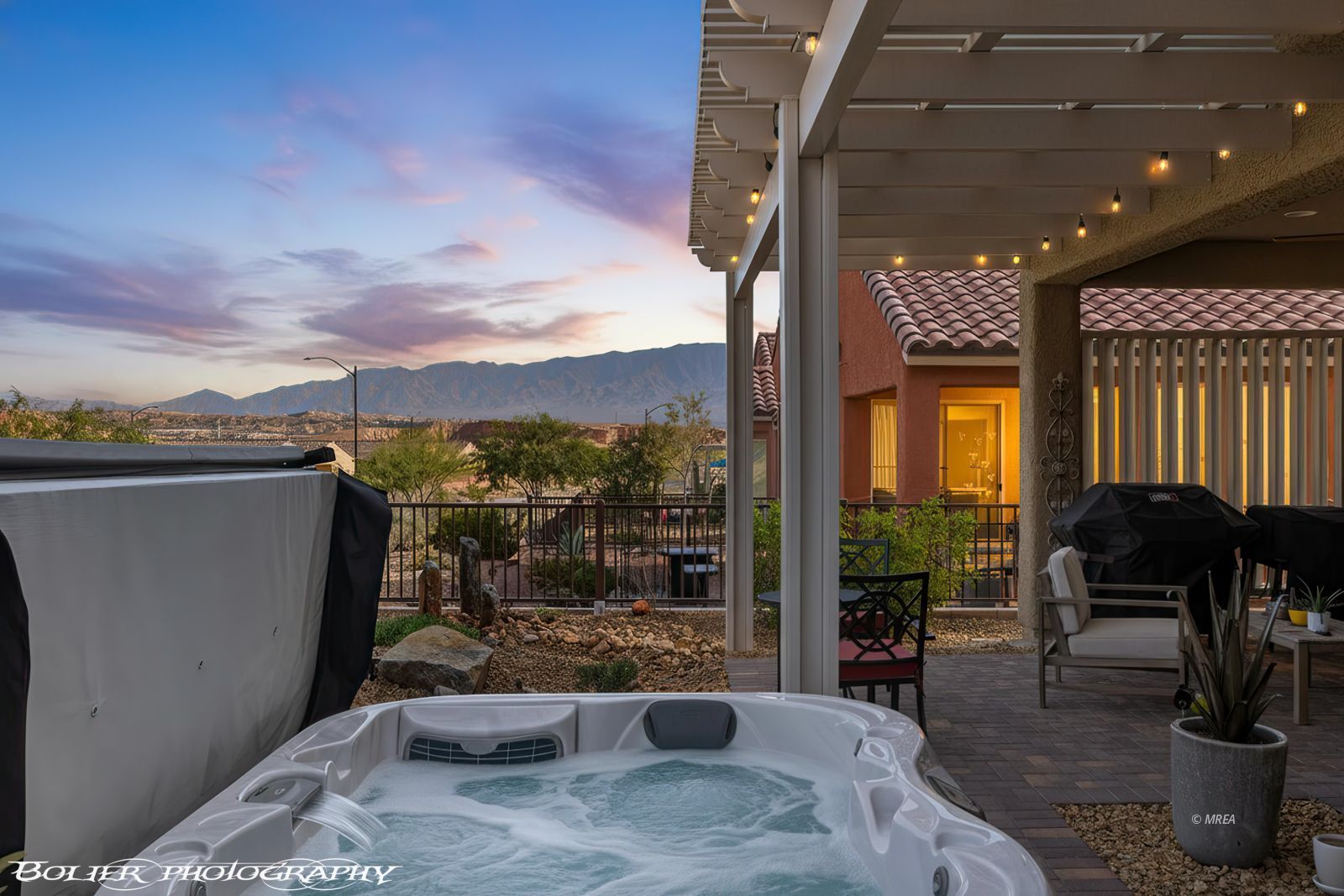 Welcome to this beautifully upgraded single-story home offering 2 bedrooms, 2 bathrooms, & a versatile den. Thoughtfully designed with luxury vinyl plank flooring throughout, this home is entirely carpet-free for a clean, modern feel.The spacious primary suite offers a feature wall & elegant bay windows that fill the room with natural light, along with a tiled walk-in shower & granite countertops for a refined touch. Granite counters continue throughout the home, complementing the stylish finishes in every space. Enjoy excellent curb appeal with a paver driveway & walkway, & continue the outdoor living experience in the fully landscaped & fully fenced backyard. The extended pergola-covered patio offers abundant shade and comfort, complete with a cozy two-person hot tub-your own private retreat.Set against a peaceful green space park, this property provides serene northern and eastern mountain views, creating a stunning backdrop from sunrise onward. The paver back patio enhances the outdoor ambiance and makes this home ideal for relaxation or entertaining. With it’s desirable layout, tasteful upgrades (over $100k) & Scenic setting, this home is the perfect blend of comfort and style