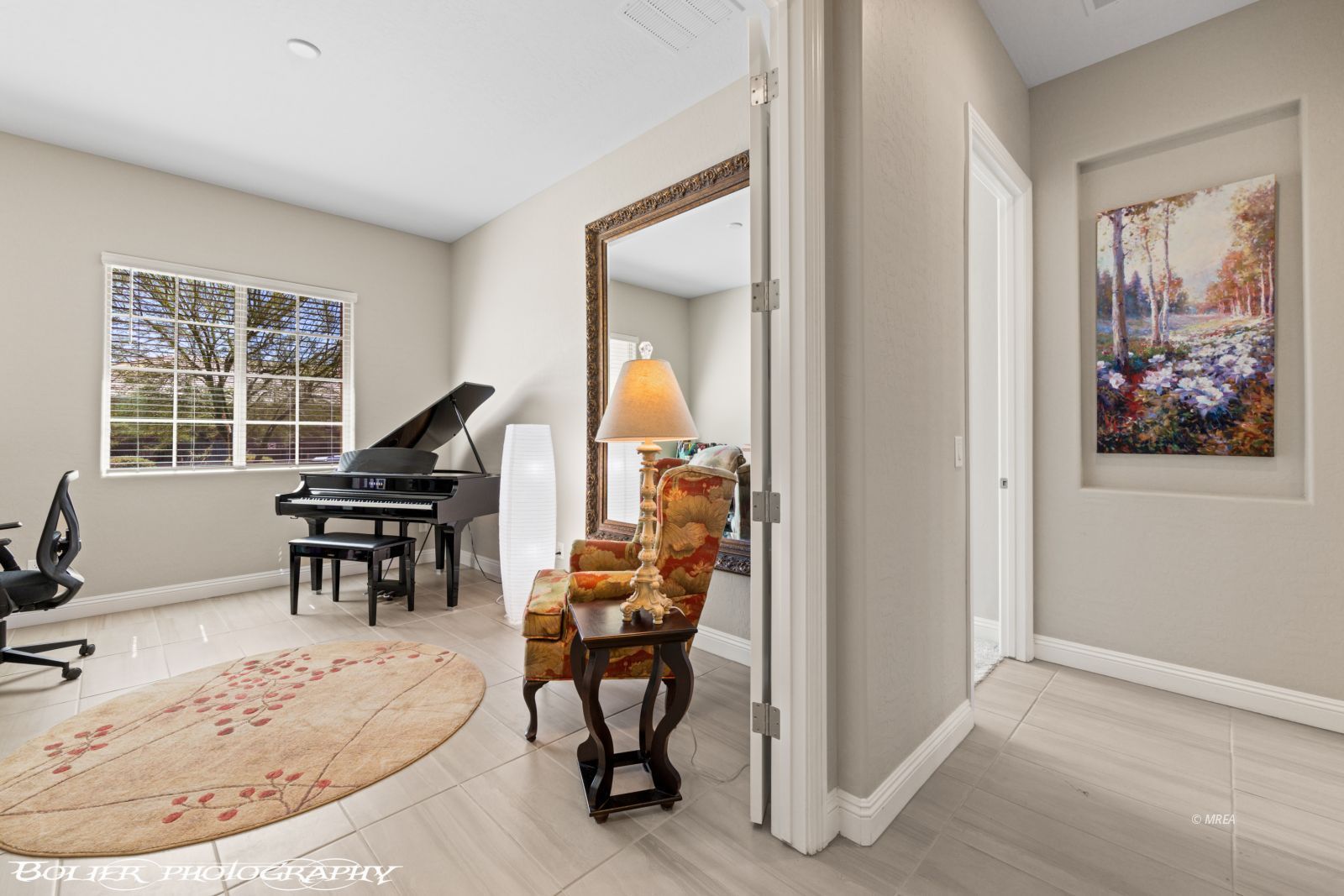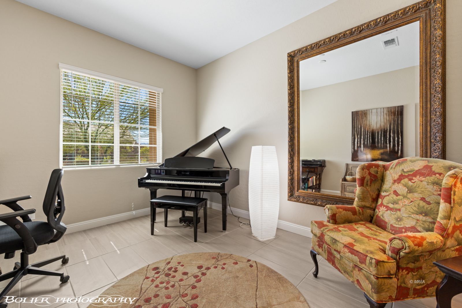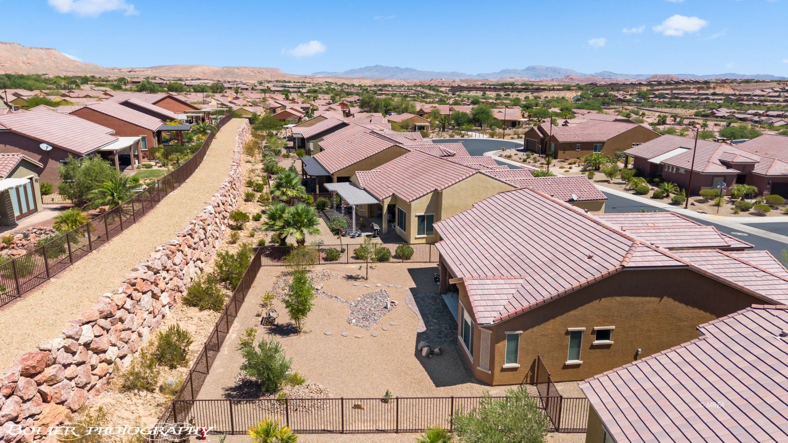 Better than new-no construction delays! This upgraded Pursuit model in Sun City Mesquite’s golf community sits on a .21-acre fully fenced lot with low-maintenance landscaping and an extended paver patio, perfect for desert living and pool potential. The covered patio features a full-length automatic solar shade. Inside, plank tile flooring covers the main living areas, while the bedrooms have new carpet. The bright, open-concept layout includes a great room with an upgraded Audio-Visual wall and fireplace. The kitchen offers an oversized quartz island, large basin sink, upgraded range hood, custom glass tile backsplash, and premium cabinetry. The main suite includes a bay window and spa-like ensuite with zero-threshold tile walk-in shower with river rock flooring, dual under-mount sinks, and a large walk-in closet. A convenient half bath and den/office/music room with double doors add versatility. Laundry room features a sink, additional cabinets, and washer/dryer included. Guest bedroom and full bath are on the opposite side for privacy. FULLY EXTENDED & finished garage offers extra room for vehicles and storage. VIDEO: https://youtu.be/Ct6gMwu-SJ0